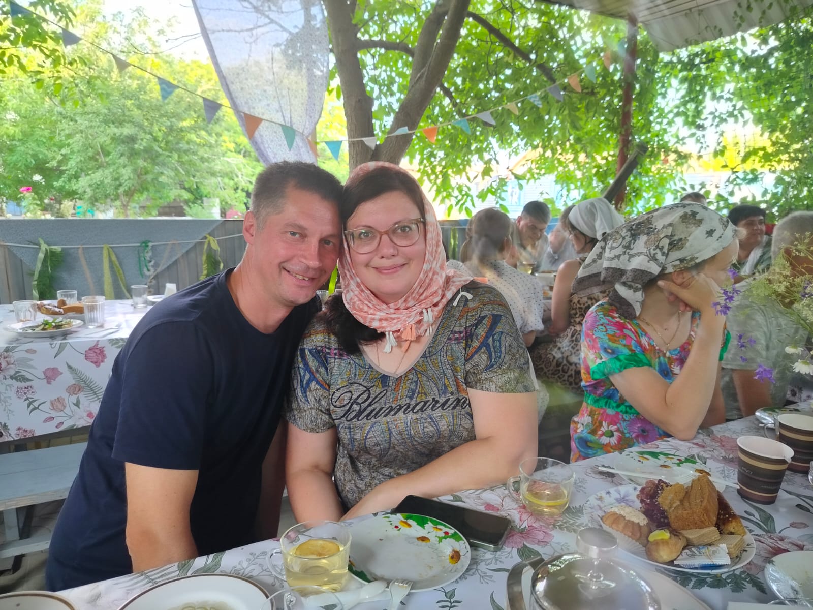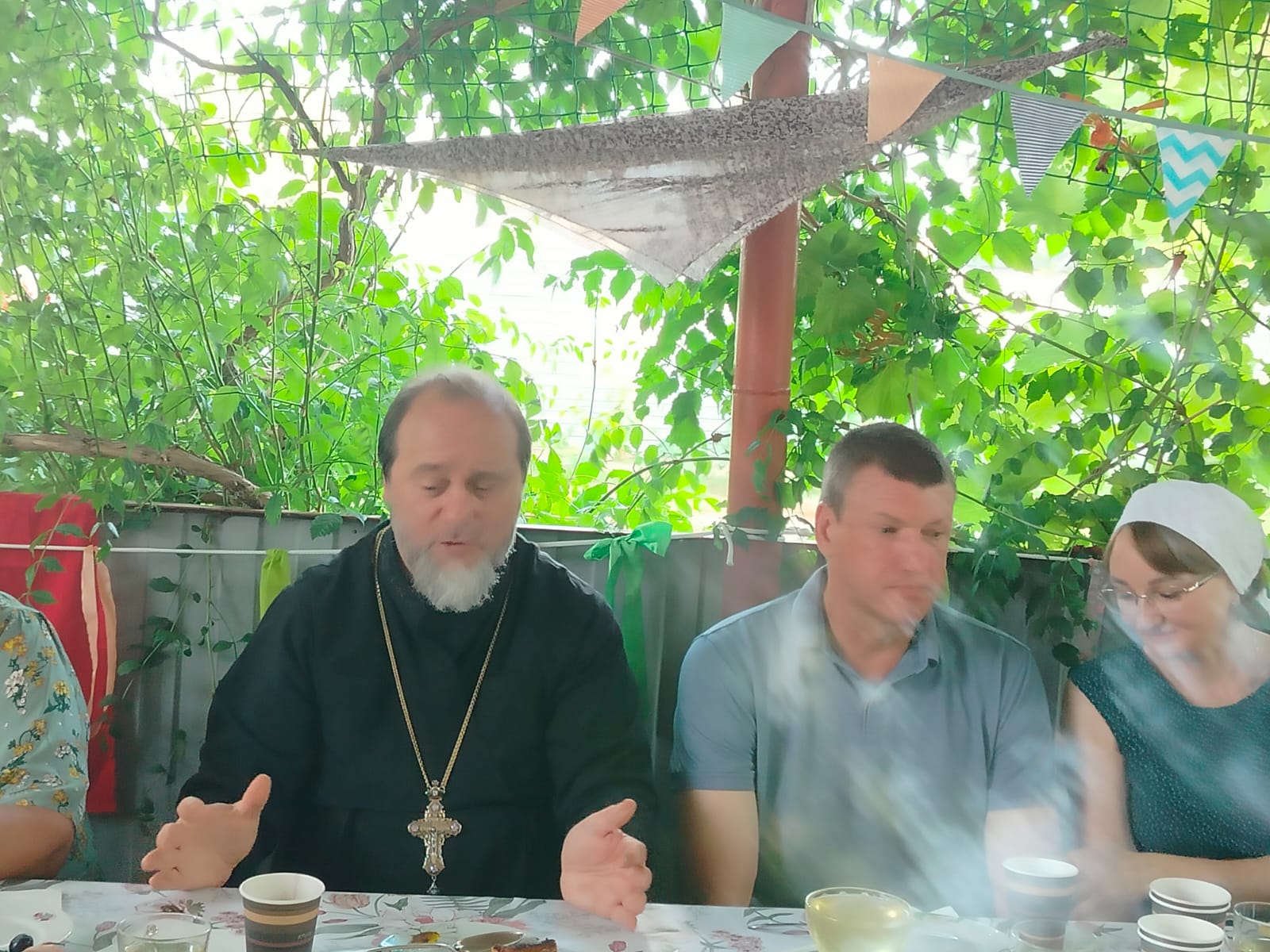Вечером, после работы, состоялось чаепитие семейных прихожан в летней беседке на территории прихода. Каждый приход является также и духовной семьей и общение не заканчивается на богослужении, но продолжается за столом. Священник рассказывал и отвечал на вопросы, все единодушно пели духовные канты и угощались чудесным чаем со сладостями.