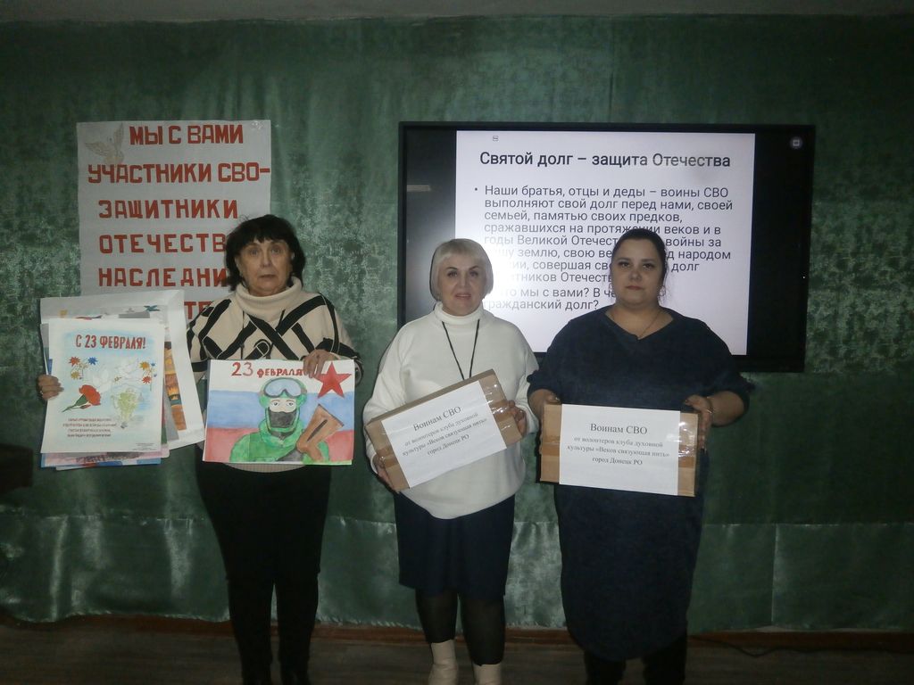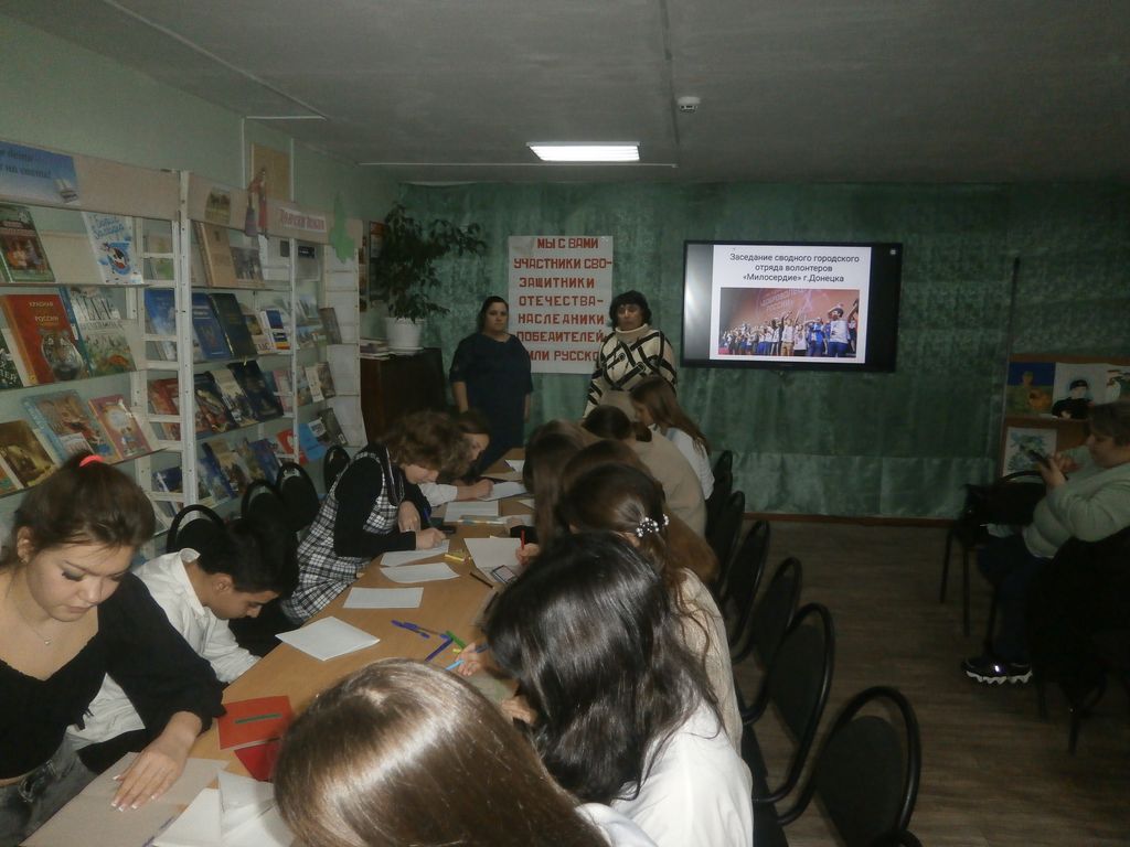 В работе приняли участие волонтеры МБОУ СОШ №18, 20, 7, 4, 3, 13, гимназии 12, выполнив задание по проведению городской акции в своих образовательных учреждениях «Воины СВО сражаются за нас ,а что сделал ты?» Они представили рисунки, презентации-поздравления «Мы с вами воины -защитники». Заседание завершилось добрым делом – написанием писем военнослужащим, изготовлением открыток и видеопоздравлением «Живая открытка нашим защитникам» от всех участников заседания и передачей их на передовую через представителя Отдела по молодежной работе Администрации г. Донецка.