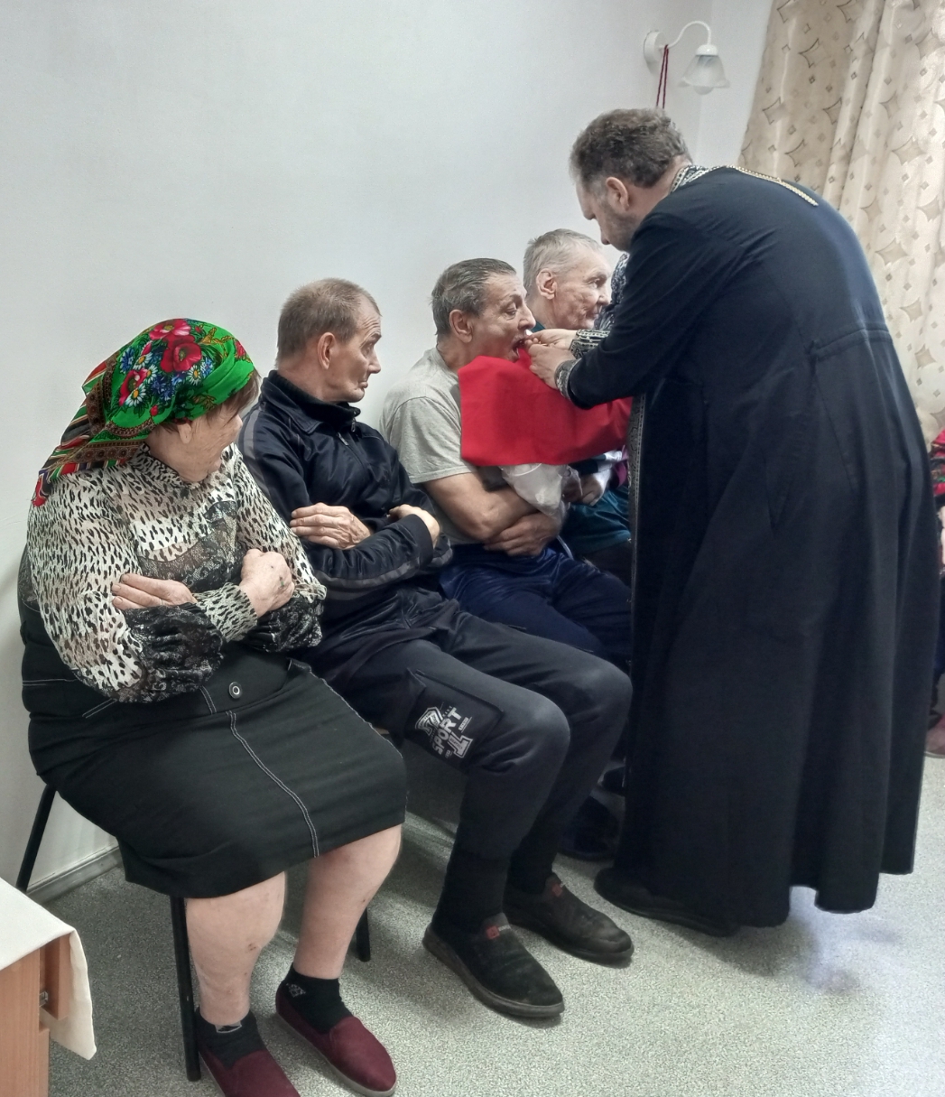 Священник совершил таинства Исповеди и Причастия, помолился о здравии постояльцев и работников учреждения, а затем провёл беседу на тему «Страстная Неделя - через скорби к радости Воскресения».