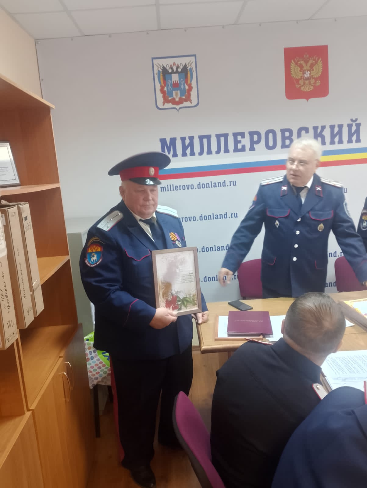 В связи с 60-летием грамотой также был отмечен дружинник конного взвода Евгений Шкондин. Нагрудным знаком «Всевеликое войско Донское» награжден участник первого организационного круга Миллеровского юрта Виктор Журавлёв.