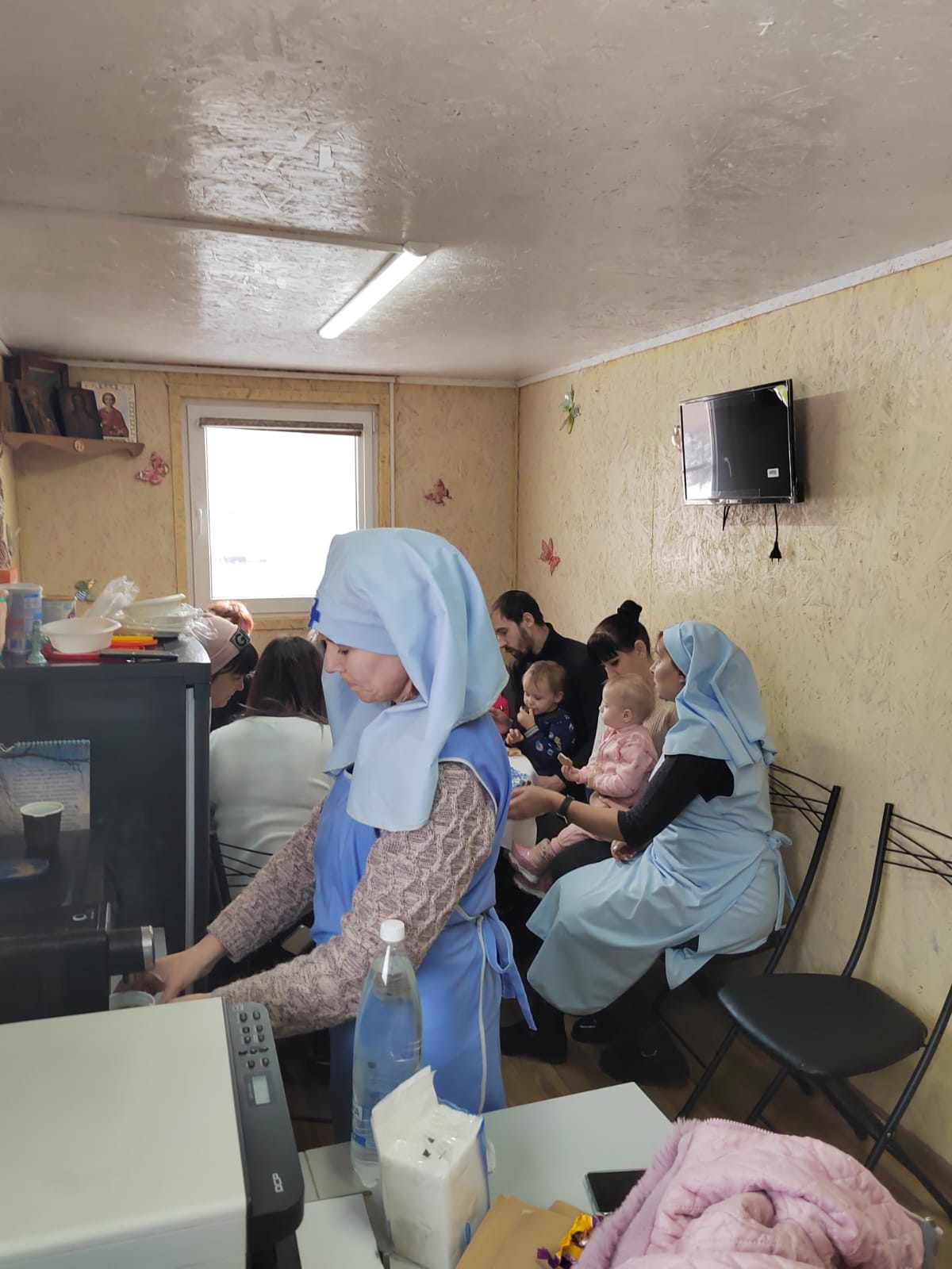 С ноября месяца, как только была смонтирована и установлена бытовка общей площадью 40кв.м., наша команда приступила к его оснащению и закупке оборудования. Беженцы и люди проезжающие из зон СВО на лечение или реабилитацию, семьи с детьми – наши благополучатели получили возможность отдохнуть и переодеть ребенка. У нас налажены контакты с приютом для бездомных «Алиса», ЦСРД, ПВР города Шахты, общежитием корпорации «Глория Джинс», где благотворительно принимают обездоленных, ищем возможности снять жилье или подбираем вариант с присмотром и проживанием с престарелым человеком или инвалидом. И если раньше людям приходилось ожидать помощи в храме, или на скамейке, то сейчас они могут переждать в нормальных условиях, покушать и попить чай. Так же в центр приходят люди, которых обидели близкие или пережившие семейное насилие женщины. Очень часто обращаются за помощью одинокие пожилые люди. Для разных случаев у нас предусмотрены разные меры поддержки и заботы. Центр постоянно благоустраивается, наши сестры милосердия постарались создать атмосферу домашнего уюта. Что-то переставляем, закупили вешалки и дорожку на пол, на стены повесили панно и детские картины. Люди отвлекаются от своей проблемы, начинают разговаривать, спрашивать, и благодаря этому проходит истерика или панические атаки, они расслабляются и более доверительно общаются с сестрами.