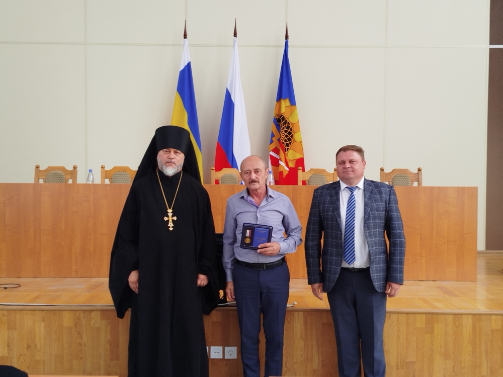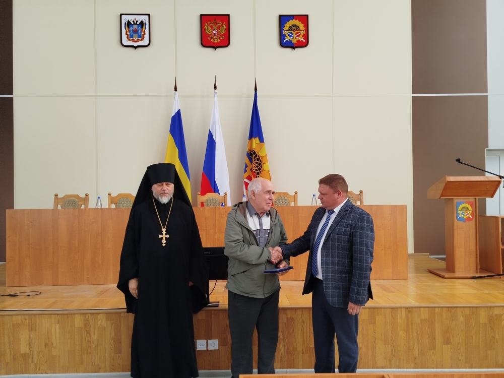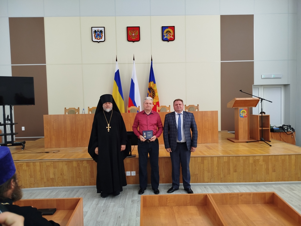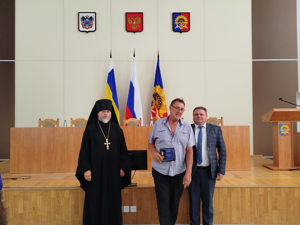 Вместе с главой районной администрации благочинный вручил церковные награды во внимание к трудам на благо Святой Церкви и Отечества - медали Шахтинской епархии «Священномученика Александра Команского» III степени приглашенным на торжество добровольцам из города и района: