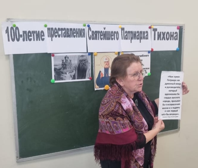 Помощник настоятеля Бурим Е.Б. рассказала о духовном подвиге служения Патриарха Тихона , который служит примером для каждого человека в настоящее время.