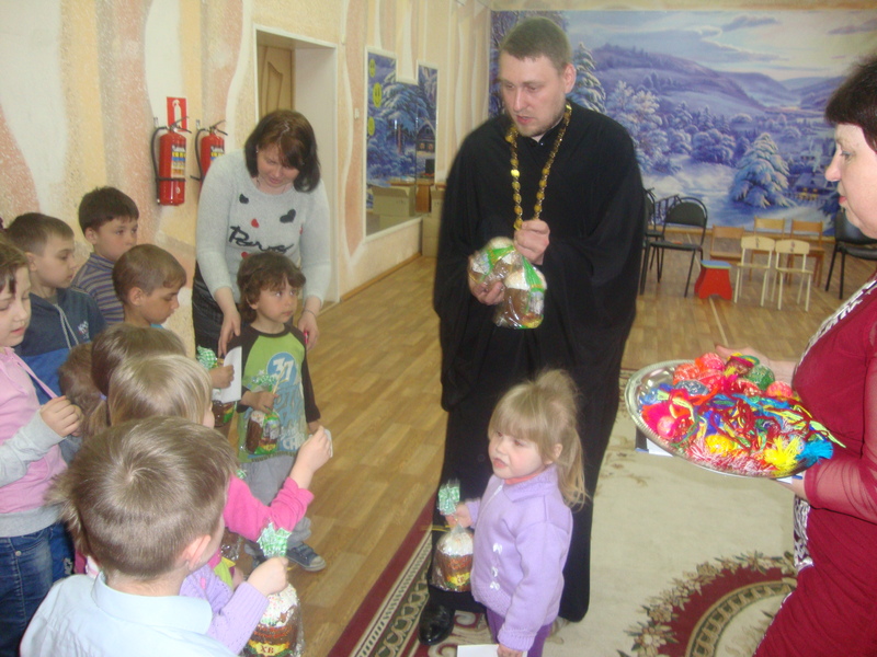 На мероприятии священник поздравил всех присутствующих со Светлым Христовым Воскресением и подарил каждому воспитаннику пасхальные куличи и другие подарки.