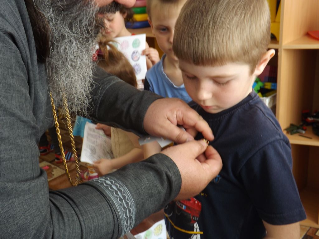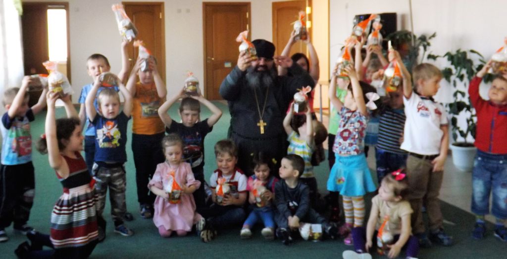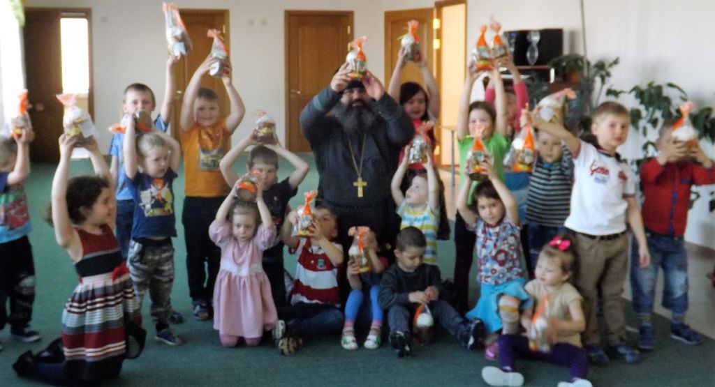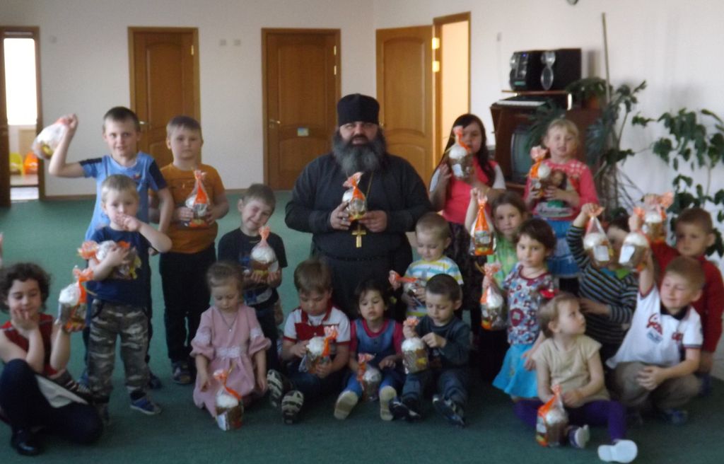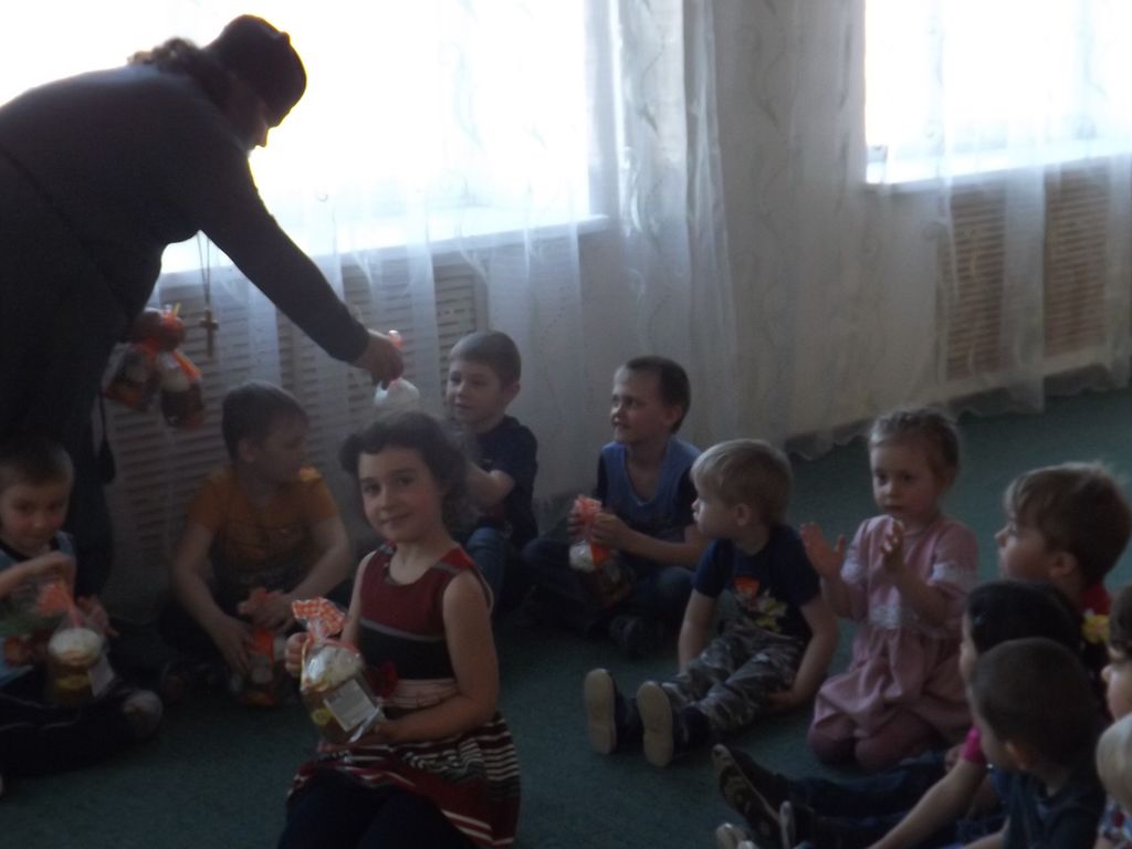 Затем иерей Александр Туховский рассказал детям о Празднике Пасхе и подарил детям сладкие Пасхальные куличи.
