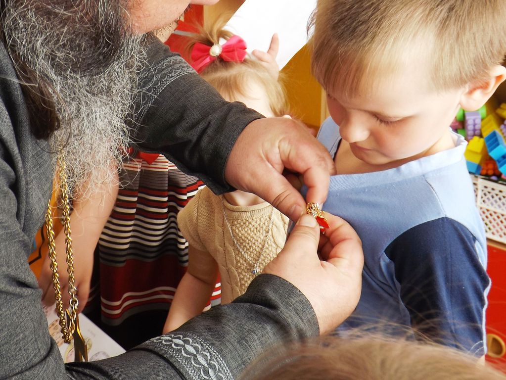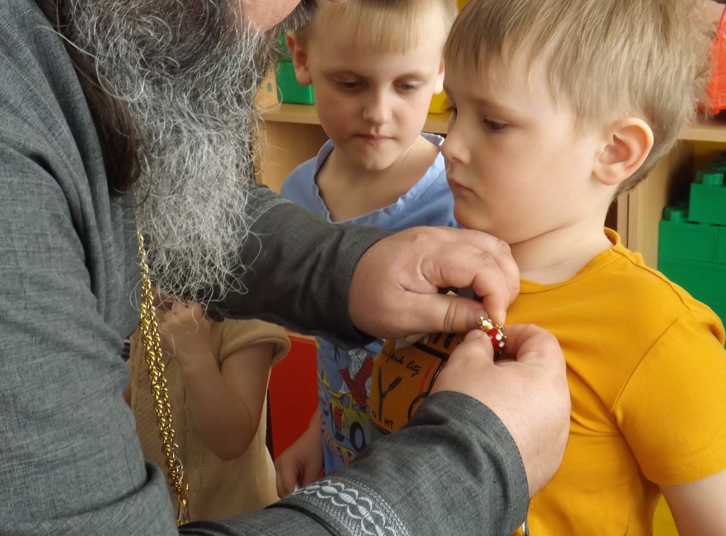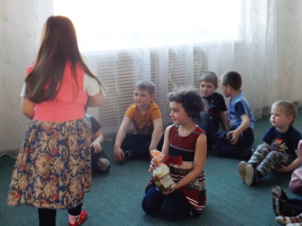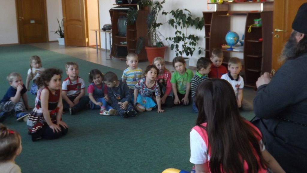 Затем иерей Александр Туховский рассказал детям о Празднике Пасхе и подарил детям сладкие Пасхальные куличи.