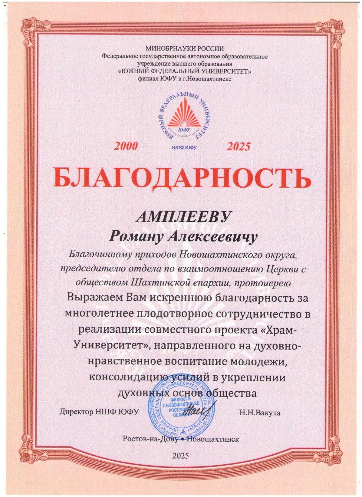 27 мая отметил 25-летний юбилей Филиал ЮФУ в городе Новошахтинске. Протоирей Роман Амплеев, настоятель храма в честь Донской иконы Божией Матери, благочинный приходов Новошахтинского округа, тепло и сердечно поздравил соработников на ниве духовно-нравственного просвещения и вручил, от лица священства, директору филиала ЮФУ в г. Новошахтинске Вакула Наталье Николаевне Благодарственное письмо. А Наталья Николаевна вручила благодарность и поблагодарила о. Романа за совместные мероприятия и форумы, духовную поддержку и окормление преподавателей и студентов.