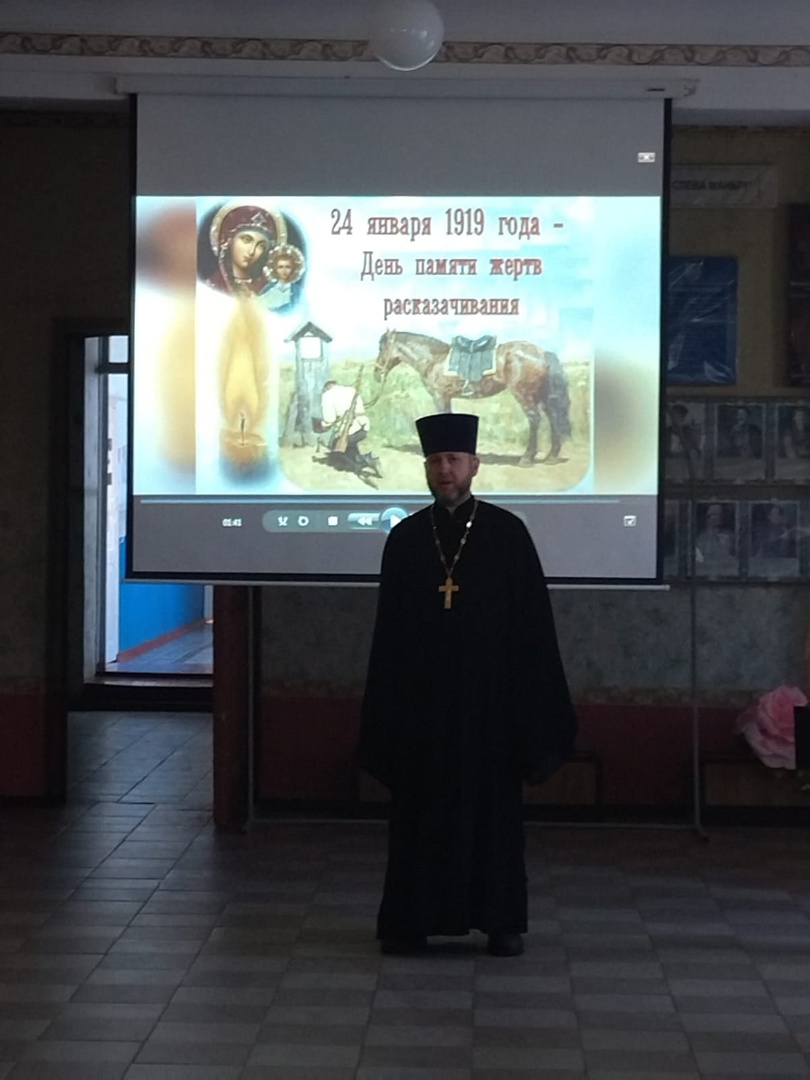 Присутствующие посмотрели фильм о трагических событиях начала XX века на Дону. Священник раскрыл духовные причины и последствия геноцида казачества и предшествующие ему события революции 1917 г., а также призвал возрождать и сохранять духовные традиции Донского казачества.