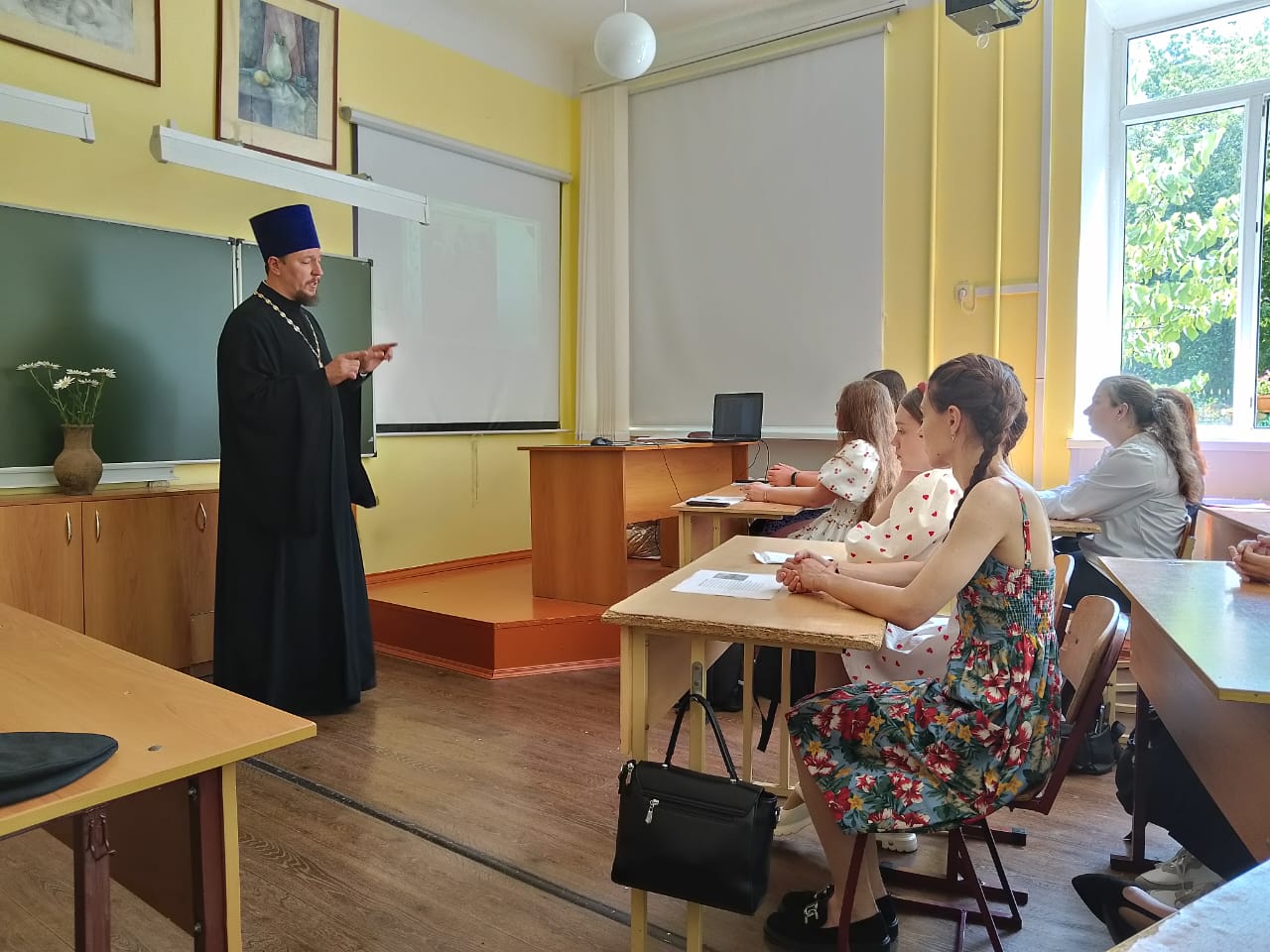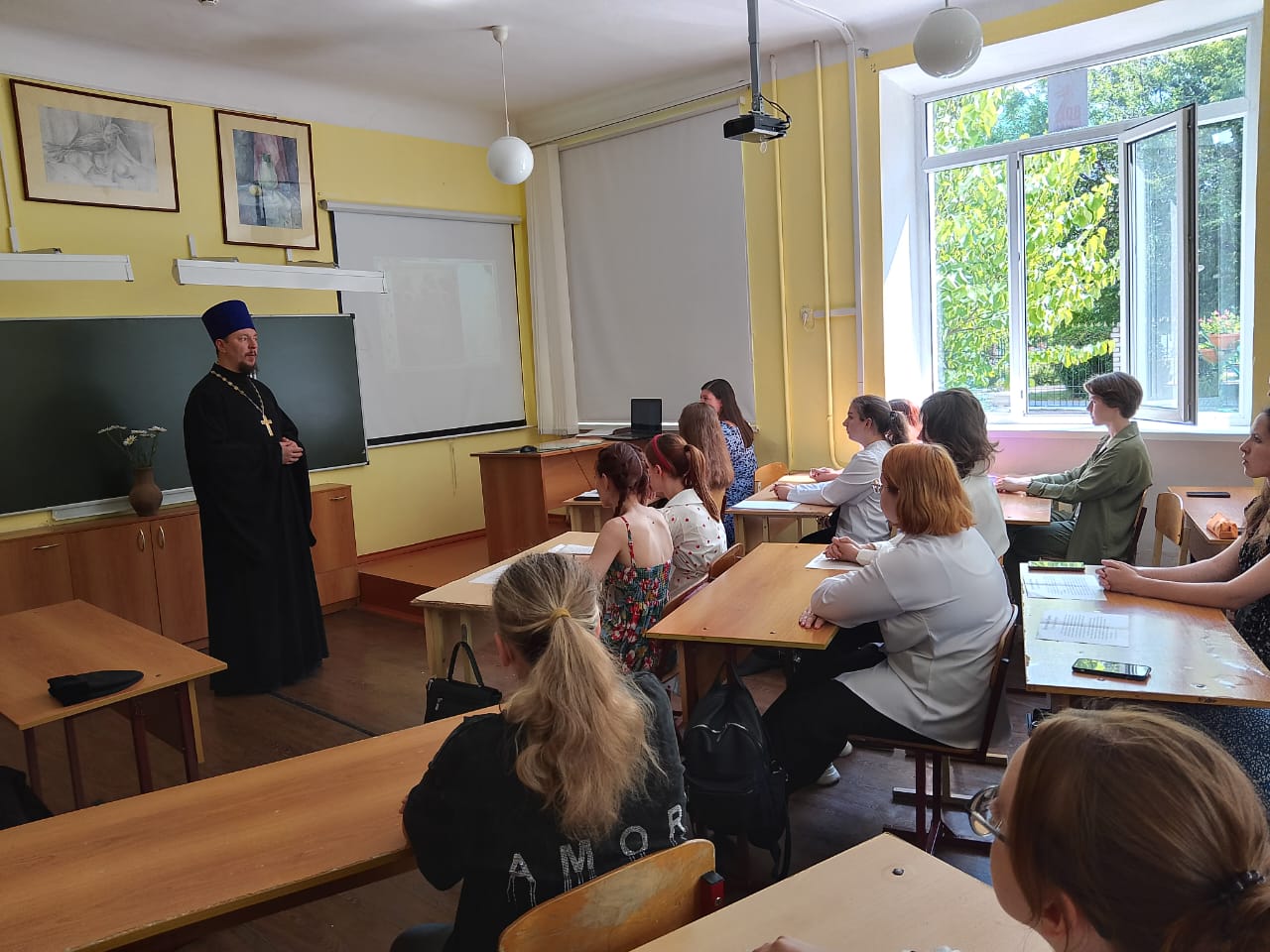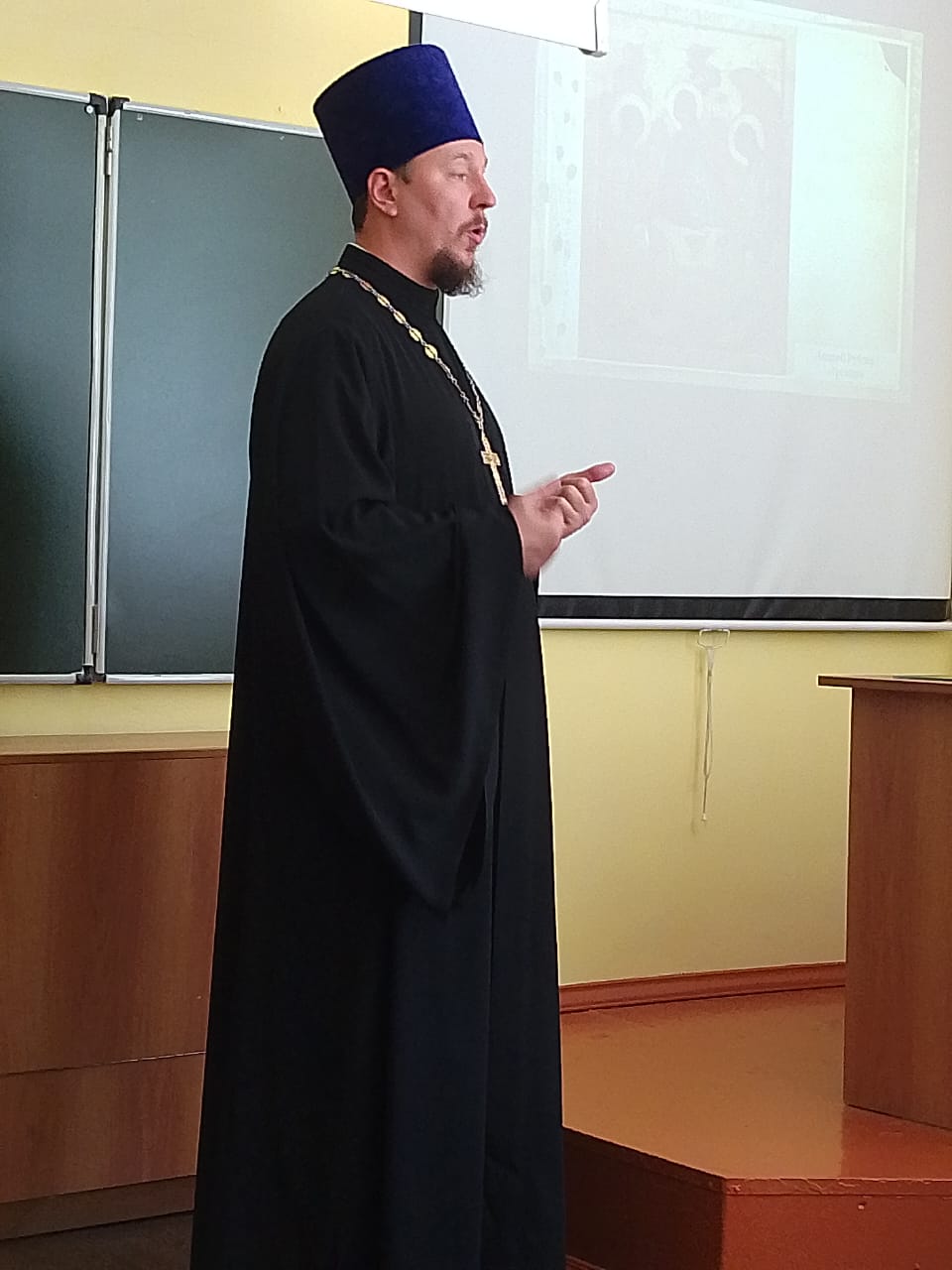 Иерей Роман рассказал присутствующим об иконе Андрея Рублёва «Троица», раскрыв её духовное и художественное значение.