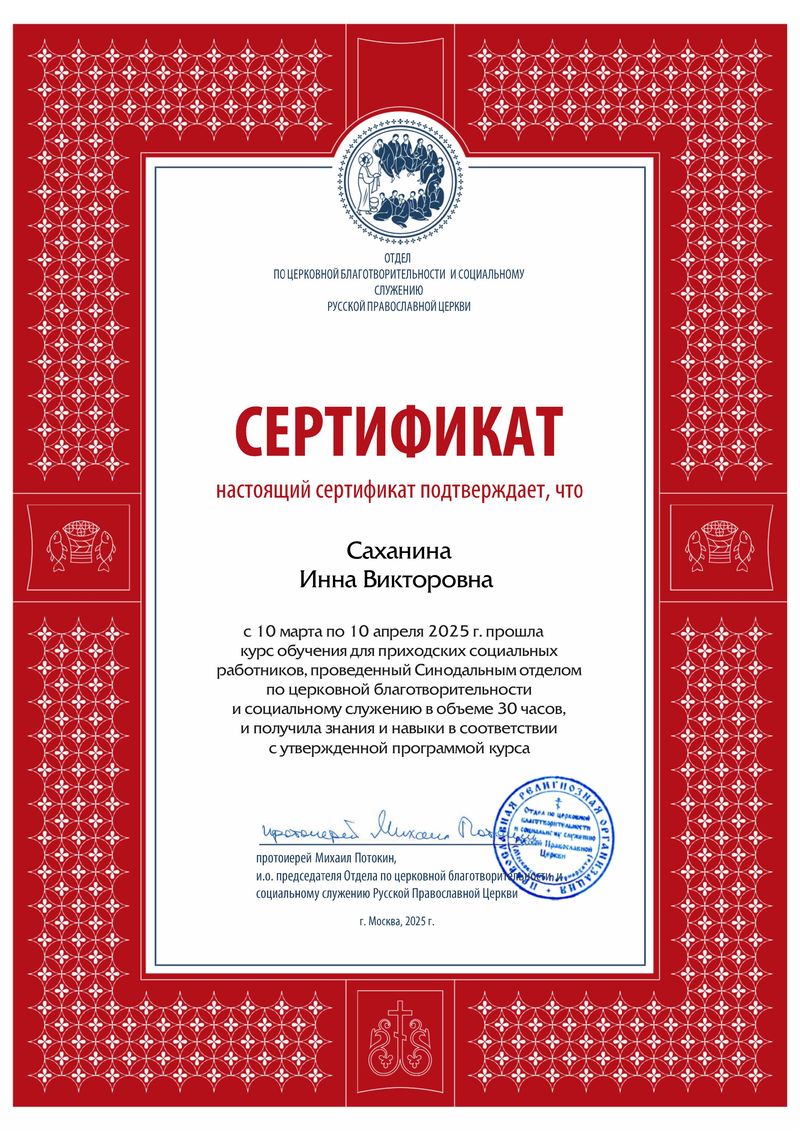 По благословению протоиерея Романа Амплеева, настоятеля храма Донской иконы Божией Матери, благочинного приходов Новошахтинского округа, руководителя отдела по взаимоотношениям Церкви с обществом, в обучении приняла участие и успешно прошла курсы помощник благочинного Саханина Инна Викторовна, получив сертификат о прохождении и успешной сдаче итоговой атестации.