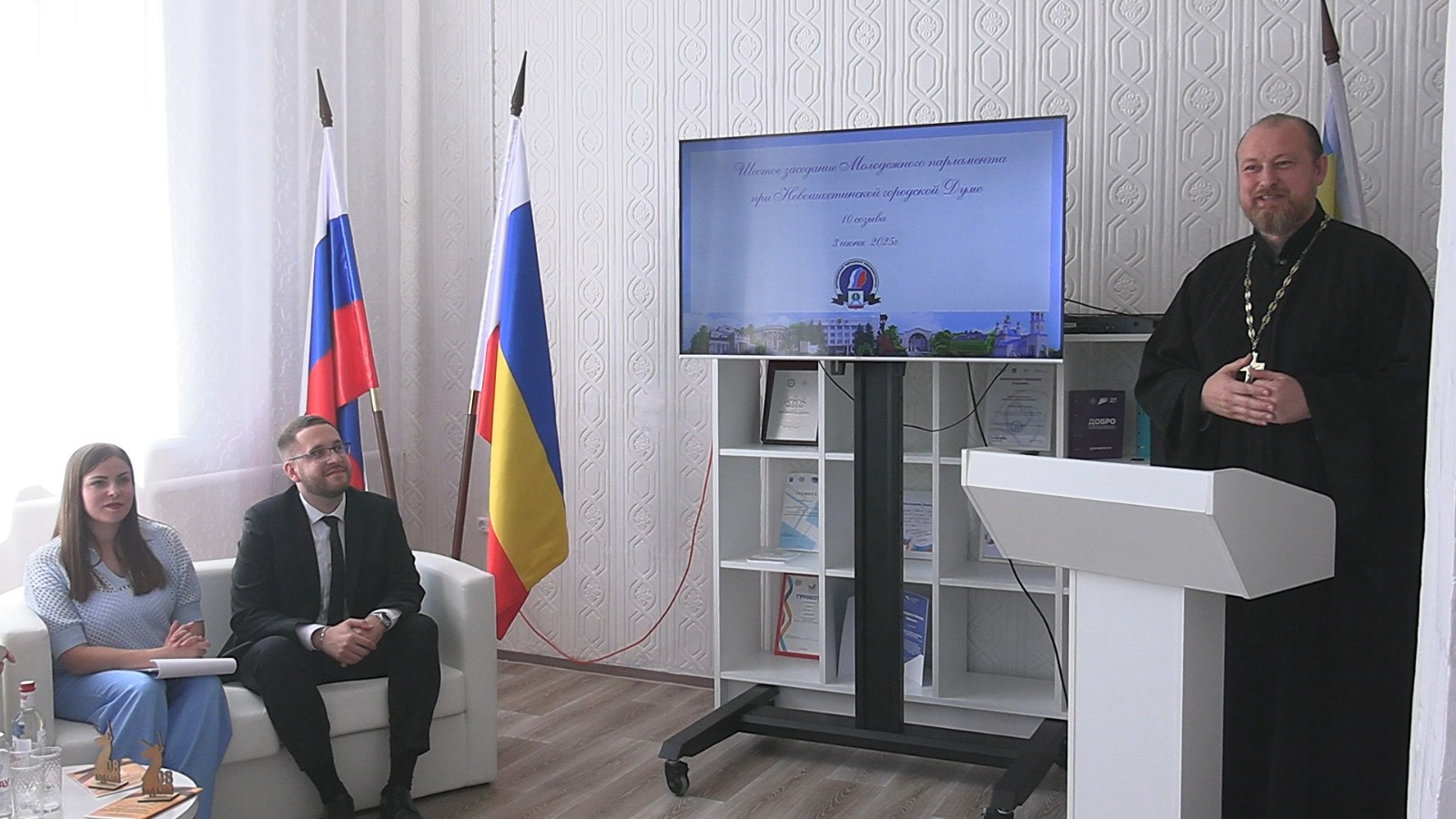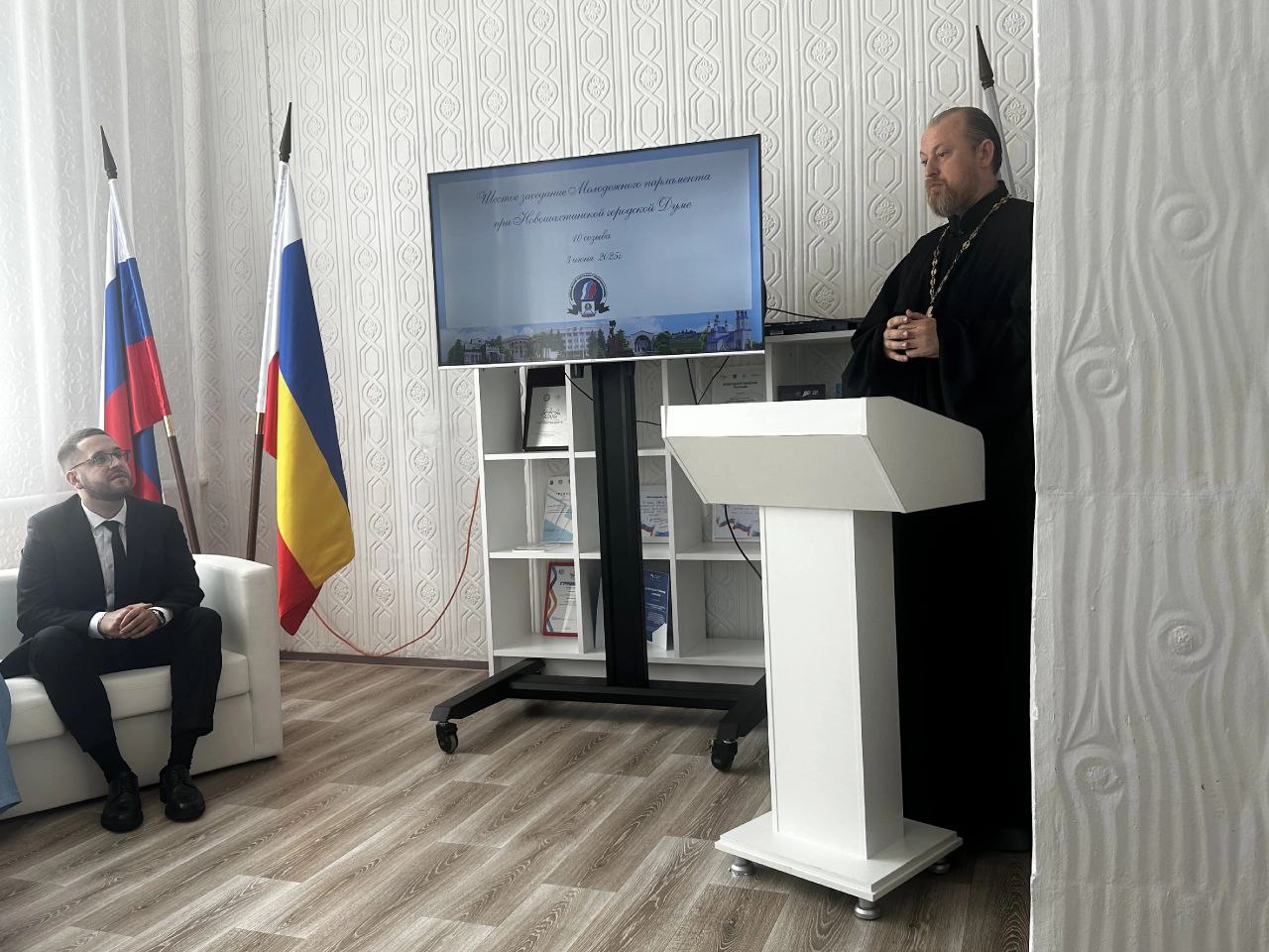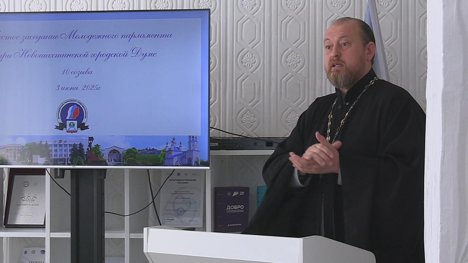 С приветственной речью перед молодыми парламентариями и их наставниками выступил протоиерей Роман Амплеев, настоятель храма Донской иконы Божией Матери, благочинный приходов Новошахтинского округа, руководитель отдела по взаимоотношениям Церкви с обществом