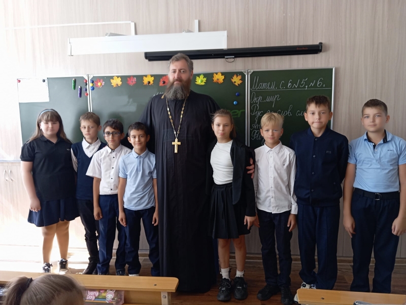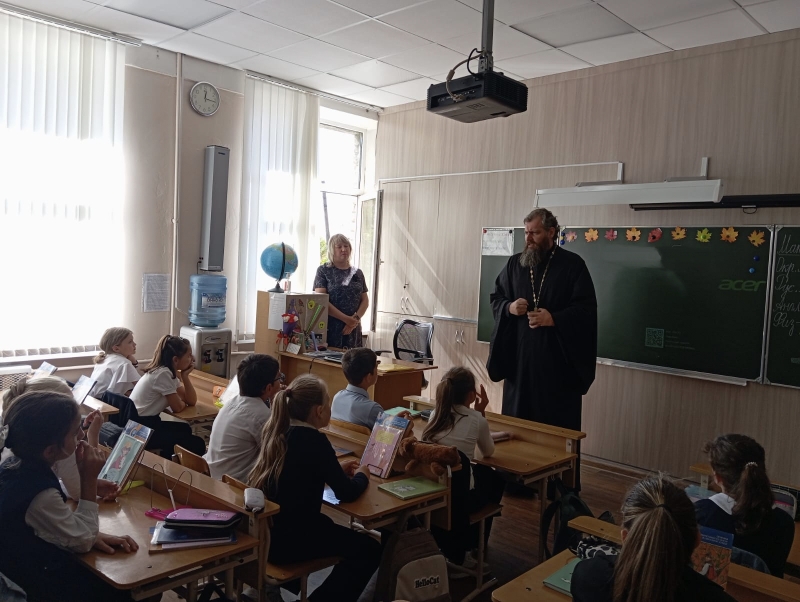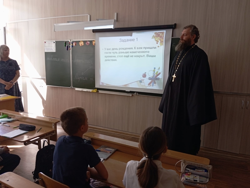 К ученикам 4 "А" и 4 "Б" классов школы №42 города Шахты пришёл на встречу настоятель храма святого праведного Иоанна Кронштадтского иерей Алексей Скосарев.