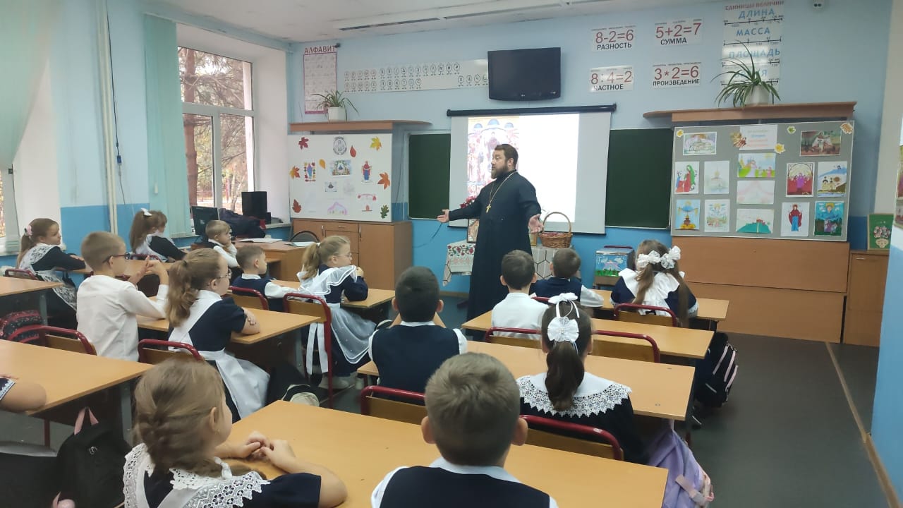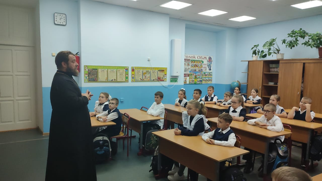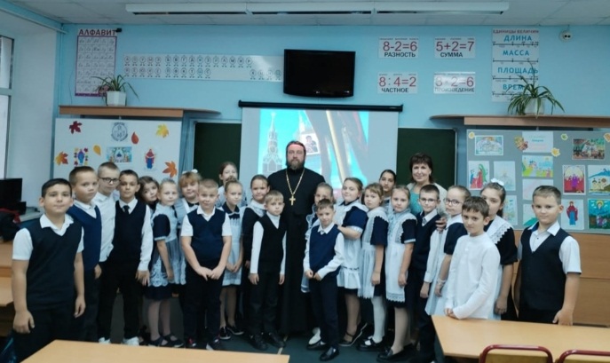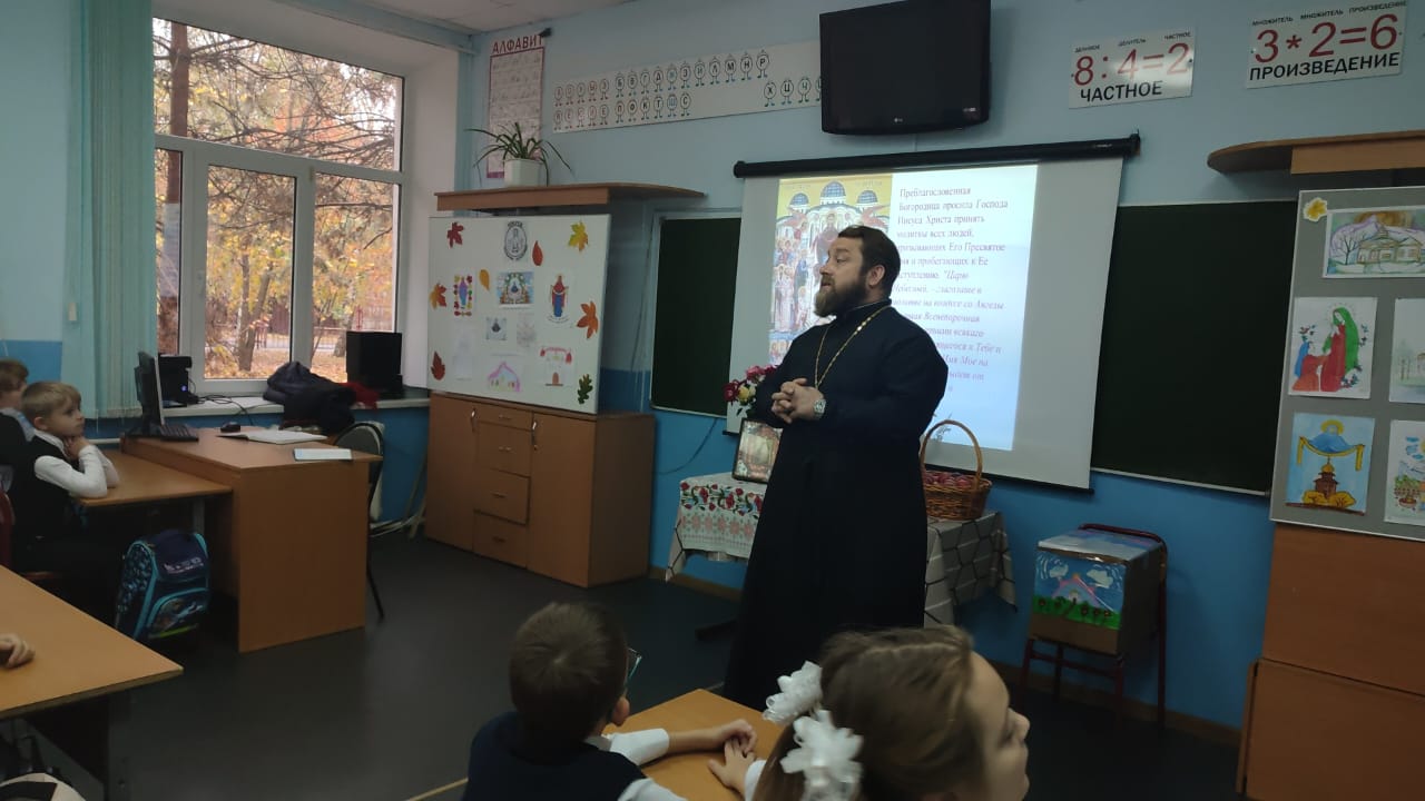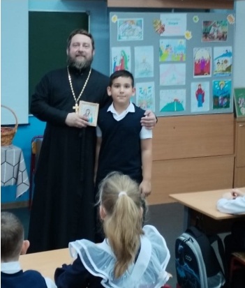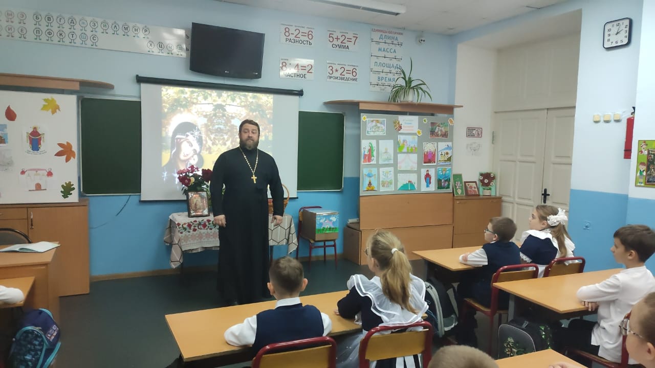 В канун православного праздника Покрова Пресвятой Богородицы в 3 «В» классе школы № 8 прошла теплая познавательная встреча с настоятелем храма апостола Андрея Первозванного иереем Симеоном Есиным.