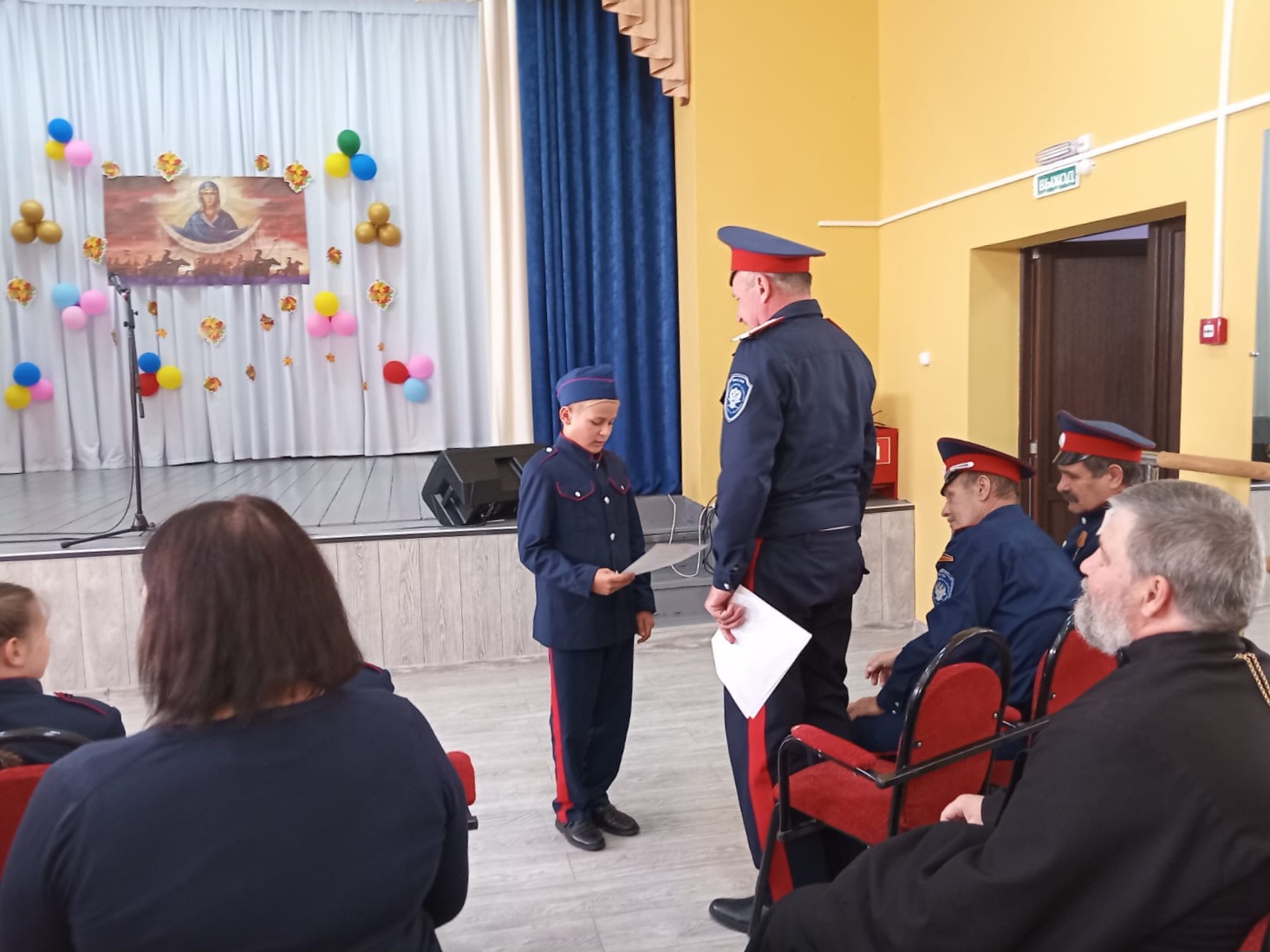 Священник прочитал молитву Святому Духу перед началом мероприятия, благословил детей на вступление в казачью семью, пожелал им успехов в трудах и начинаниях, а также передал от Пантелеимоновского храма пос. Майского выпечку для чаепития.