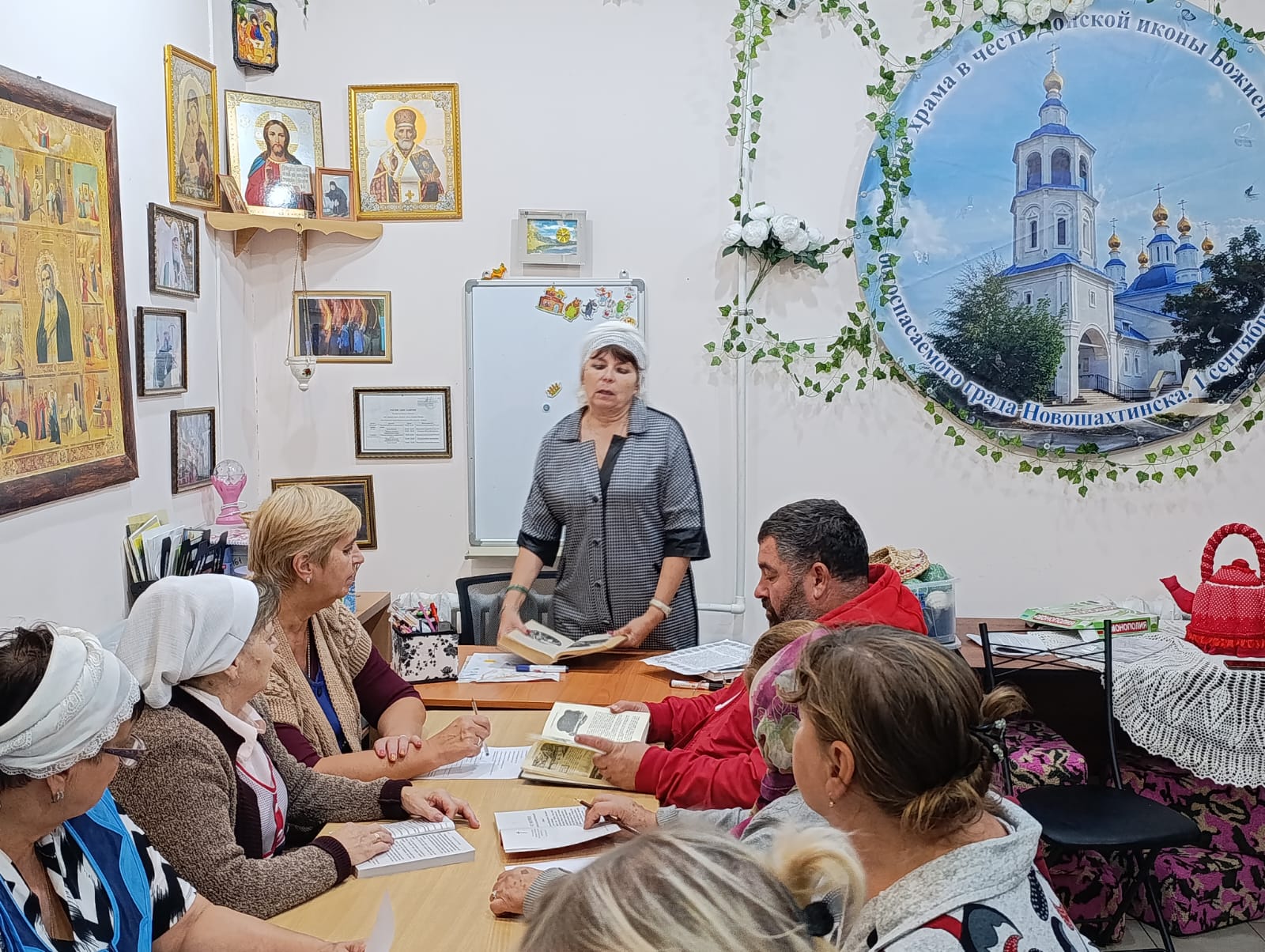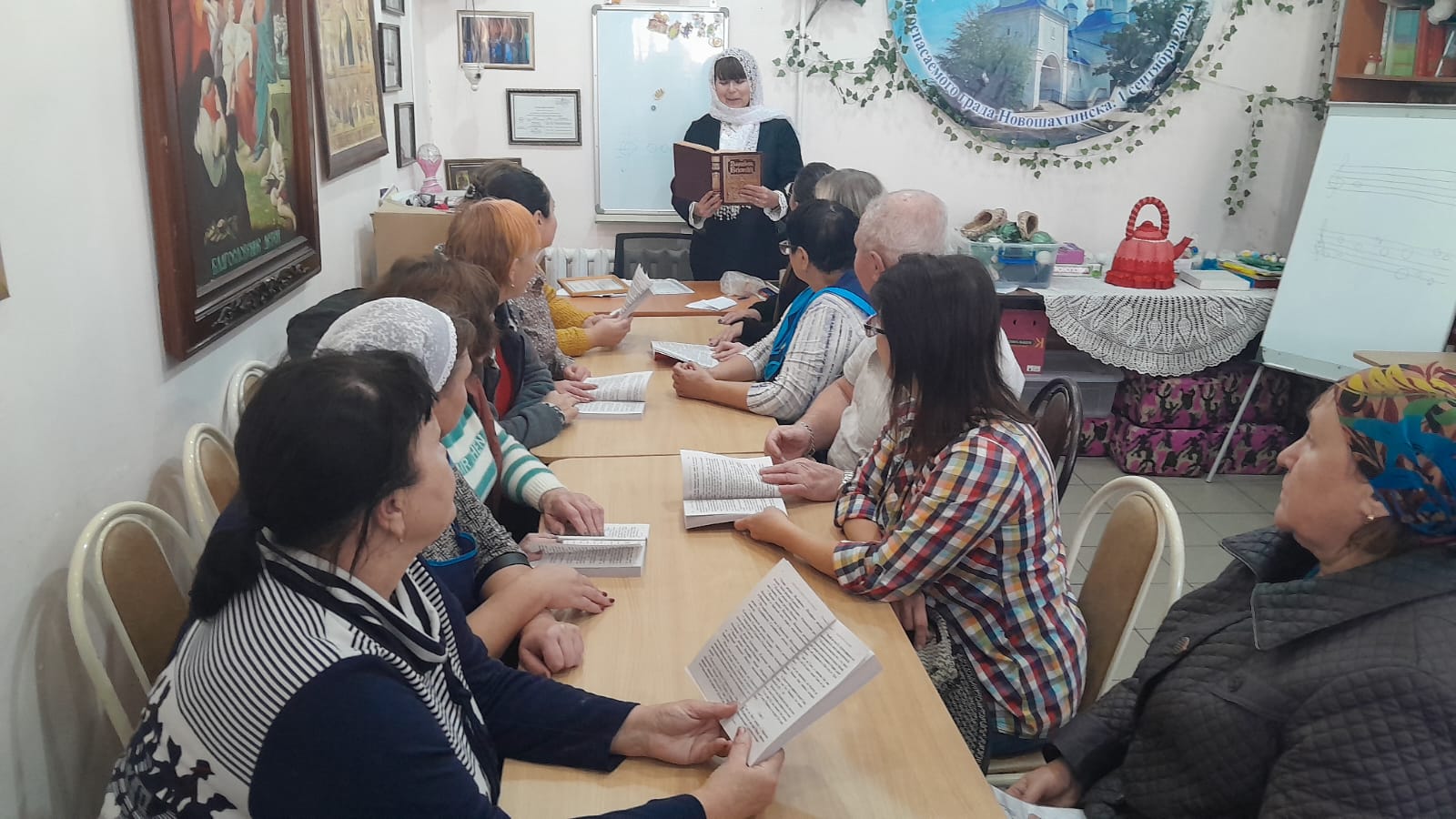 В сентябре и октябре, по благословению протоиерея Романа Амплеева, настоятеля храма в честь Донской иконы Божией Матери, председателя отделов Шахтинской епархии по взаимодействию с казачеством и взаимоотношениям Церкви с обществом, продолжаются занятия и беседы в группе «Светочъ» Донского храма по изучению Евангелия, Библии и Псалтыри.