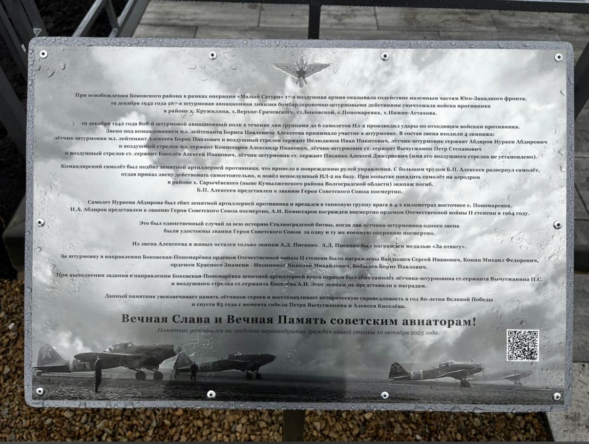 Здесь 19 декабря 1942 года во время освобождения Боковского района от немецко-фашистских захватчиков погиб экипаж 808-го штурмового авиаполка. Пилот старший сержант Петр Степанович Вычугжанин и воздушный стрелок старший сержант Алексей Иванович Киселев. Данный экипаж не был представлен к награждению. Открытие памятника, спустя 83 года с момента гибели Петра Вычугжанина и Алексея Киселева, в год 80-летия Великой Победы и в Год защитника Отечества восстанавливает историческую справедливость.