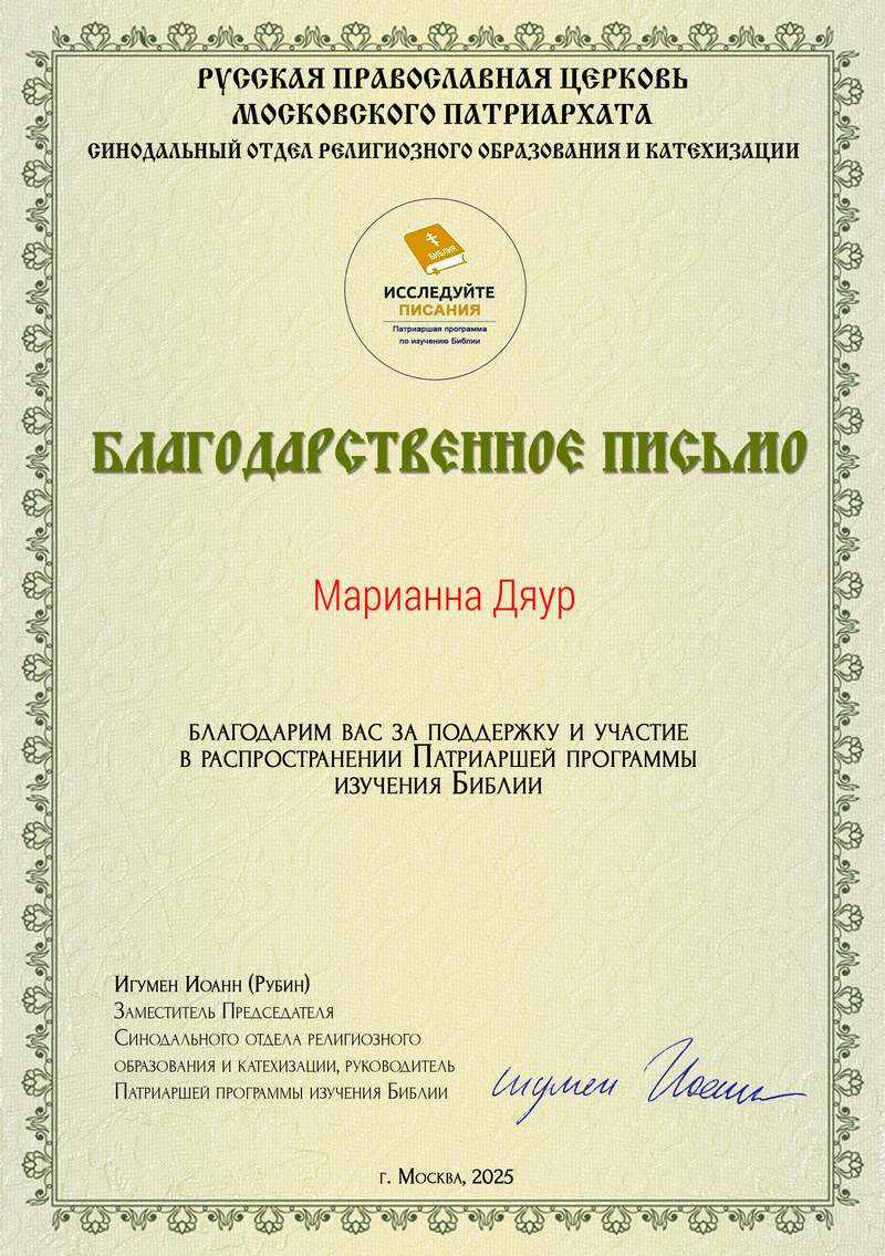 Марианна Дяур, помощник благочинного по распространению Патриаршей программы изучения Библии в Зверево-Никольском округе, была удостоена благодарственного письма от заместителя председателя Синодального отдела религиозного образования и катехизации, руководителя программы Патриаршего изучения Библии, игумена Иоанна (Рубина). Награда вручена за активную поддержку и участие в распространении этой важной общецерковной инициативы.