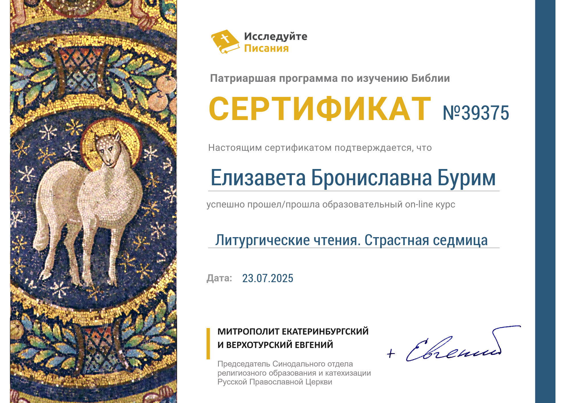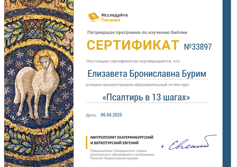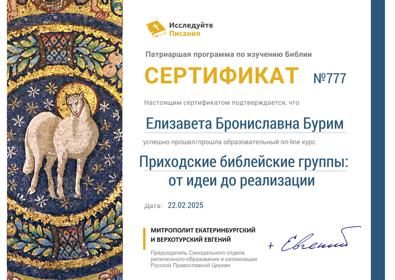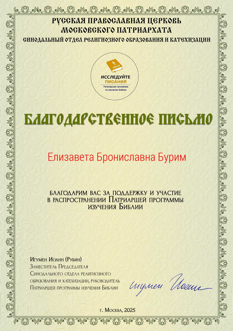 По благословению настоятеля храма святого великомученика Георгия Победоносца х. Усьмана Багаевского района протоиерея Романа Мясникова, его помощник по образованию Бурим Е.Б. приняла участие в Патриаршей программе по изучению Библии «Исследуйте Писания».