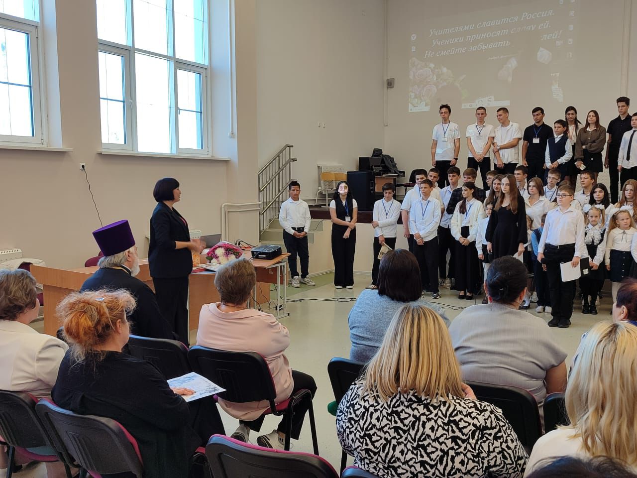 В школе №15 состоялся праздничный концерт «Учителями славится Россия», посвященный Дню учителя. Почетным гостем мероприятия стал протоиерей Митрофан Мухин.