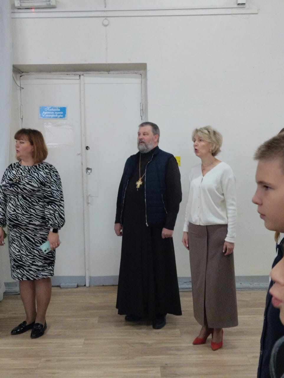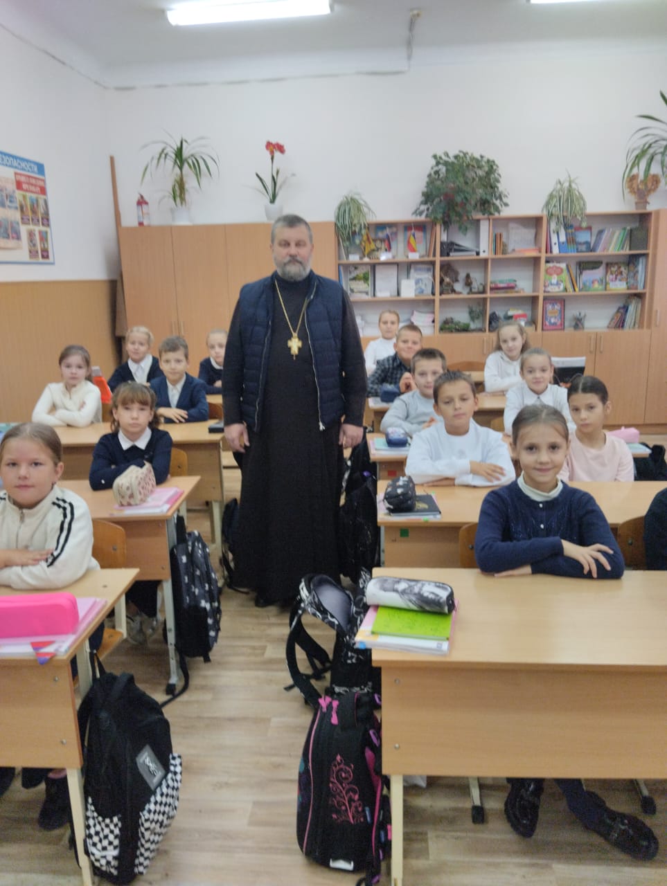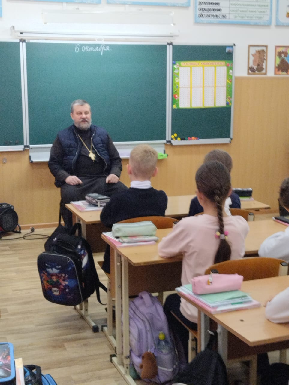 В рамках урока "Разговоры о важном" протоиерей Сергий Сергошин посетил школу №43 пос. Майский, принял участие в традиционном построении по случаю начала учебной недели, а также встретился с учениками 4-го класса.