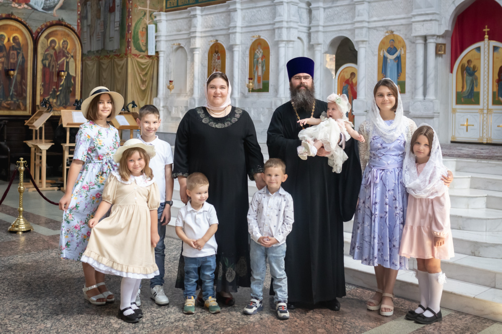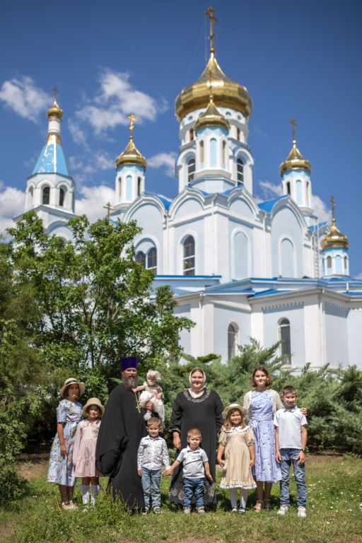 Первая дочь Елизавета родилась у нас в Москве в 2010 году, ей скоро исполнится 15 лет. Остальные дети: Платон, Феодосия, Стефанида, Евдокия, Никон, Даниил, Варвара родились на плодотворной донской земле. Всех детей мы называем в честь конкретных святых. Например, Елизавету назвали в честь преподобной мученицы Елизаветы Федоровны Романовой – удивительной святой, которую мы особо почитаем. Платон назван в честь священномученика Платона, Феодосия получила имя не только в честь святой, но и в честь моей прабабушки, которая была очень верующим и набожным человеком. Стефанида названа в честь мученицы Стефаниды, Евдокия – преподобной Евдокии, супруги князя Дмитрия Донского. Никон носит имя Никона Радонежского, ученика преподобного Сергия. Даниил назван в честь князя Московского Даниила, сына святого Александра Невского, который, кстати, является моим покровителем. И Варвара – в честь великомученицы Варвары. Всего у нас восемь детей, и мы находимся в ожидании девятого малыша.