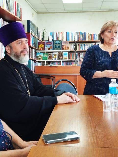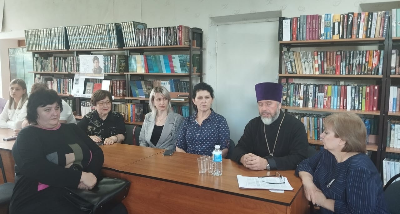 В районной библиотеке прошел круглый стол «Книга, слово – источник духовной силы в прошлом, настоящем и будущем». Беседу с учителями и библиотекарями провёл настоятель храма святителя Николая ст. Багаевская протоиерей Александр Маштанов.