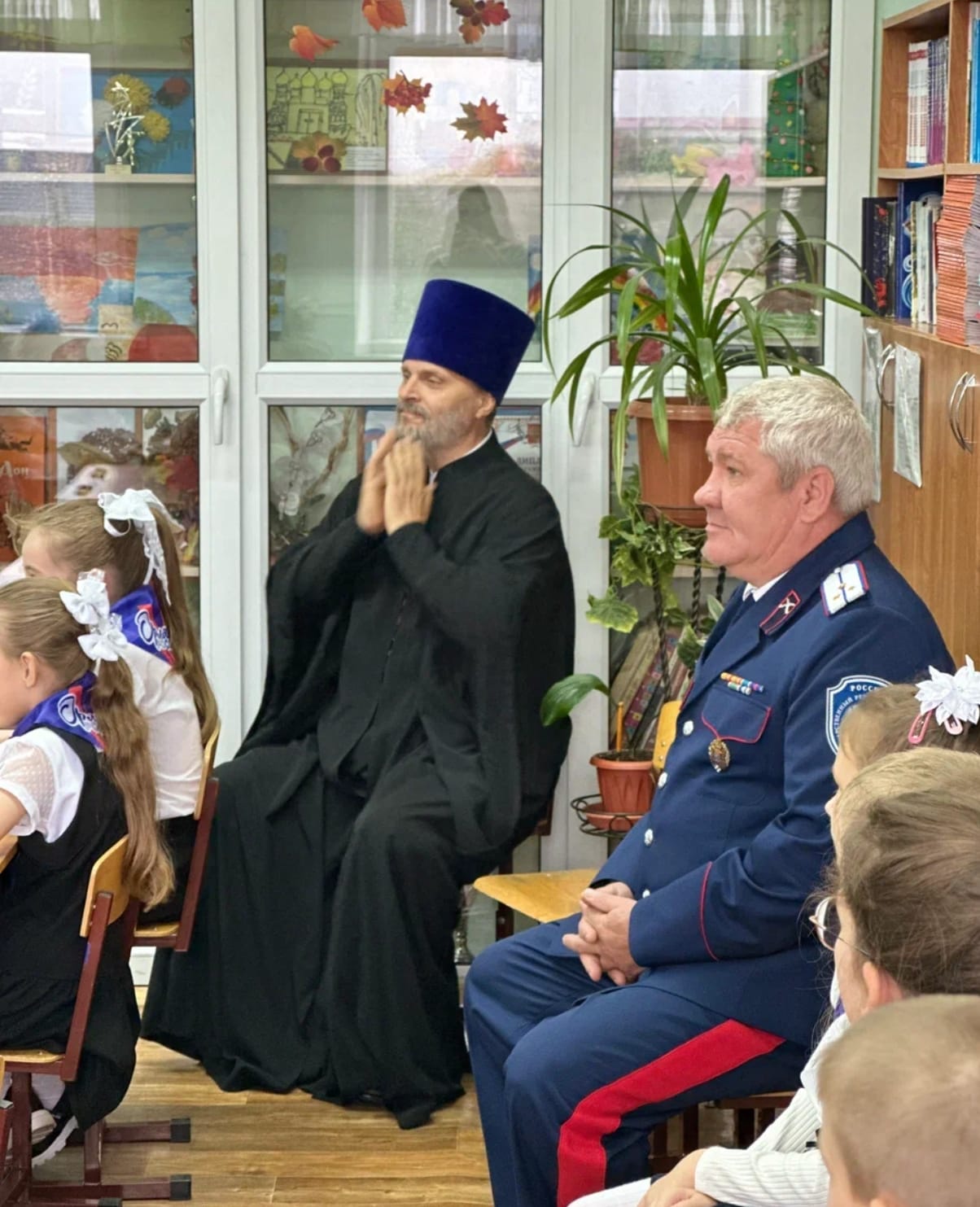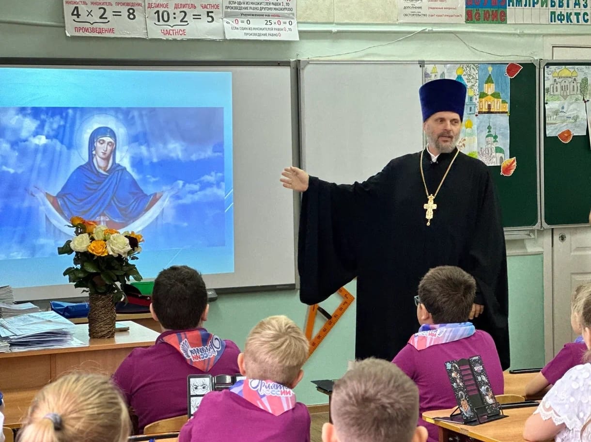 Священник Константин Крахмалев рассказал школьникам историю праздника: о явлении Пресвятой Богородицы верующим во время осады Константинополя и о Её покрове как символе защиты. Ребята узнали, почему Покров является одним из самых почитаемых праздников, какие традиции с ним связаны и как его отмечают в разных регионах России.