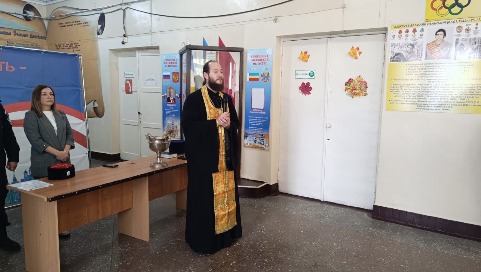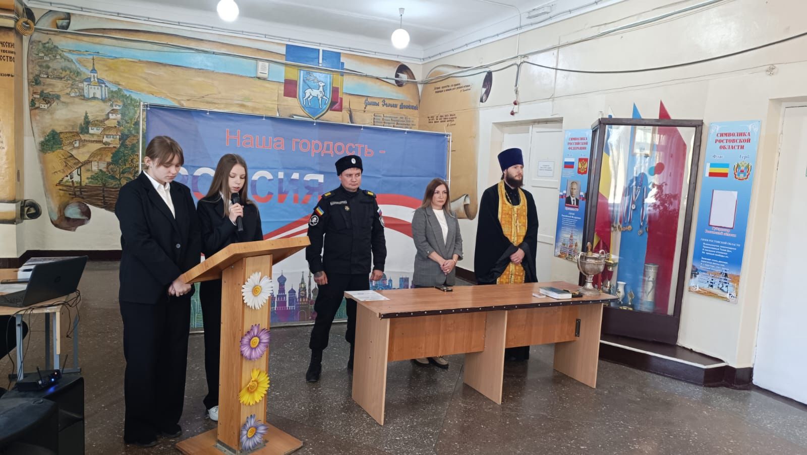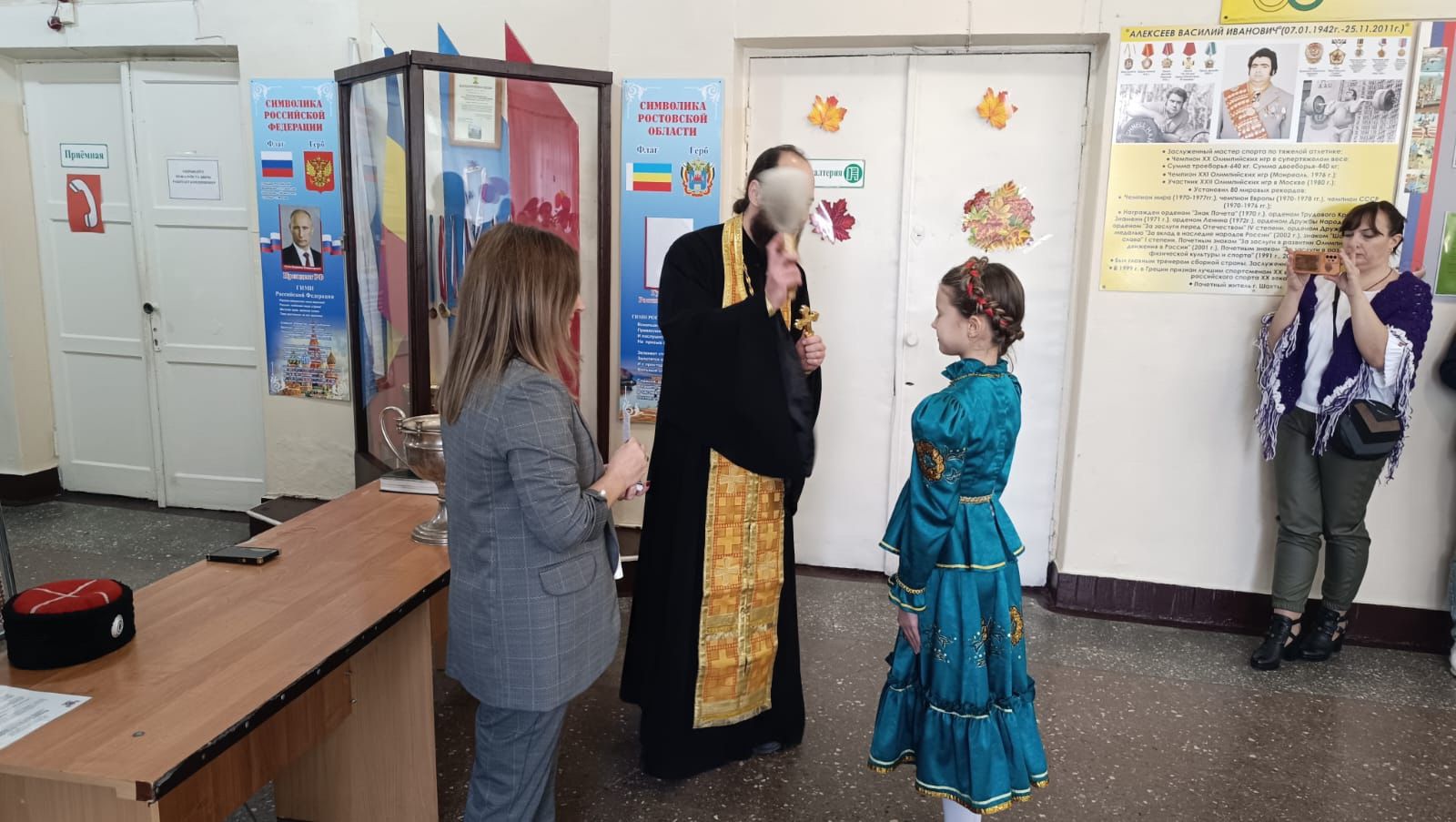 Настоятель Свято-Покровского храма иерей Олег Брехов, присутствовавший на празднике, совершил молитву, окропил учащихся и учителей святой водой и каждому вручил на память об этом дне небольшой образ Донской иконы Божьей Матери. Также священник обратился к юным казачатам и их родителям с напутственным словом.