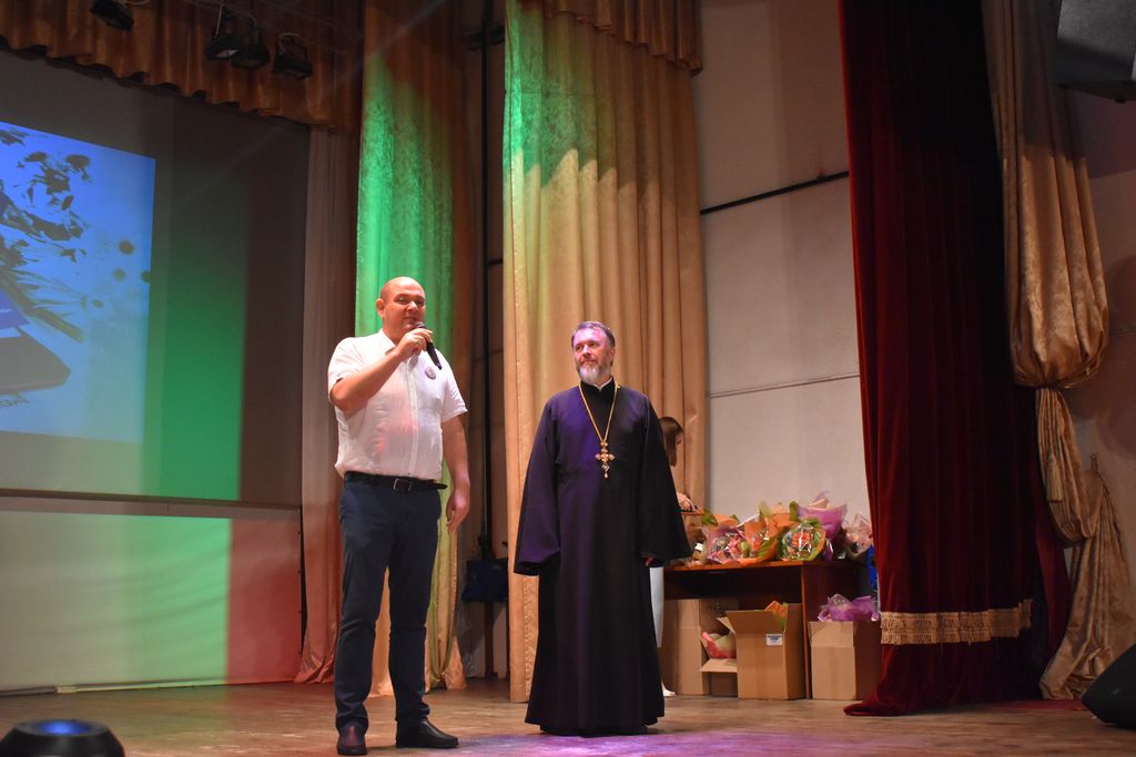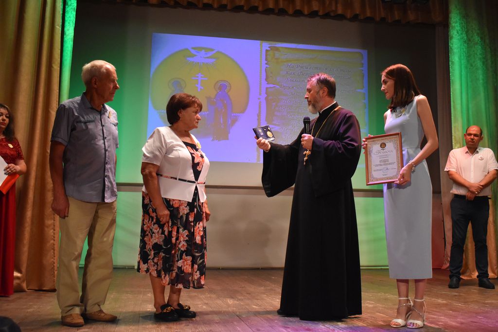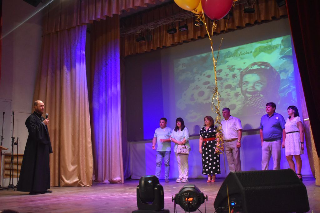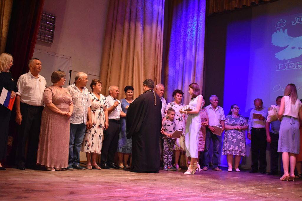 Медалью «За Любовь и Верность» была награждена семья Барышевых Виктора Михайловича и Татьяны Алексеевны из х. Красный. В апреле этого года семья отметила 45 лет совместной жизни. Для вручения награды на сцену был приглашен благочинный Багаевского церковного округа протоиерей Александр Маштанов, после слов поздравлений священник вручил награду семье.