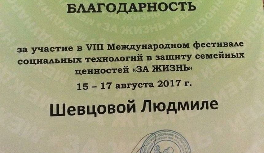 Фестиваль собирает более 300 гостей – защитников жизни из более чем 100 регионов Российской Федерации, Белоруссии, Украины, Сербии, Чехии, Польши, Венгрии, Финляндии, США и множества других государств ближнего и дальнего зарубежья — вплоть до африканских стран. Фестивальные мероприятия включают в себя крестный ход, пленарное заседание, секции, круглые столы, рабочие площадки, обучающие семинары и тренинги, мастер-классы, дискуссии, ярмарку, выставку и концерты. И в этом году впервые на данную конференцию отправился психолог от Миллеровского благочиния Шевцова Людмила Леонидовна. Помимо тренингов, семинаров и прочего Людмила помолилась на ночной литургии в храме Пресвятой Богородицы в Ясенево. По приезду Людмила Леонидовна на встрече с настоятелем Свято-Анреевского храма иереем Максимом Кибановым поделилась впечатлениями и полученным опытом, продемонстрировала привезенную литературу. Отметила, что эта поездка оказалась очень продуктивной для дальнейшего развития движения "За жизнь" на местном уровне, а именно в работе кабинета доабортного консультирования при ЦРБ г. Миллерово, где и осуществляется деятельность психолога уже 3-й год. Так же ей была вручена благодарность за участие в фестивале.