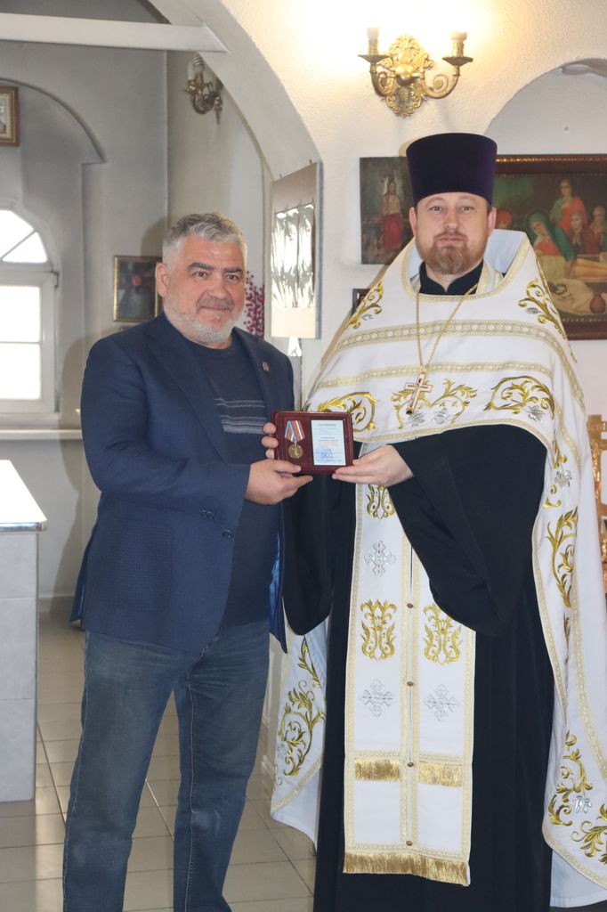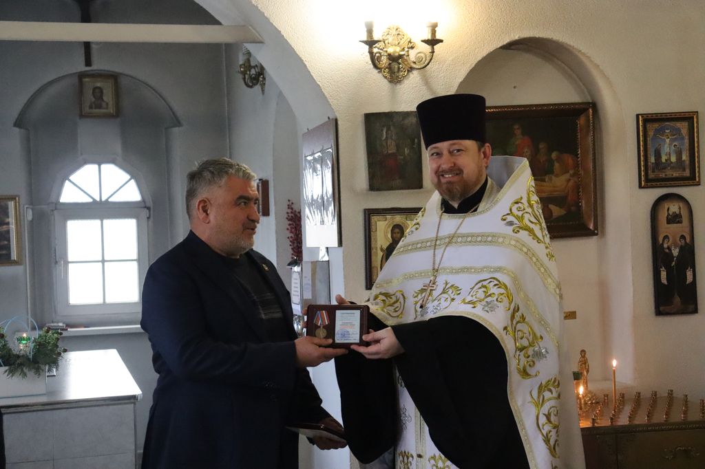 В приветственном слове Валерий Владимирович поблагодарил священника за его труд на благо мира и победы, за помощь в отправке грузов в зоны СВО. За 2022 год Донским храмом было собрано и переправлено 34 тонны различных гуманитарных грузов, оказывается всесторонняя помощь и содействие добровольцам, перевозящим гуманитарную помощь. Валерий Владимирович подчеркнул, что храм стал теплым приютом для всех проезжающих через Несветаевский таможенный пост: уставшие с дороги, добровольцы и беженцы всегда находят кров и пищу, духовную поддержку, помощь в логистике и перегрузке в Донском храме Новошахтинска.