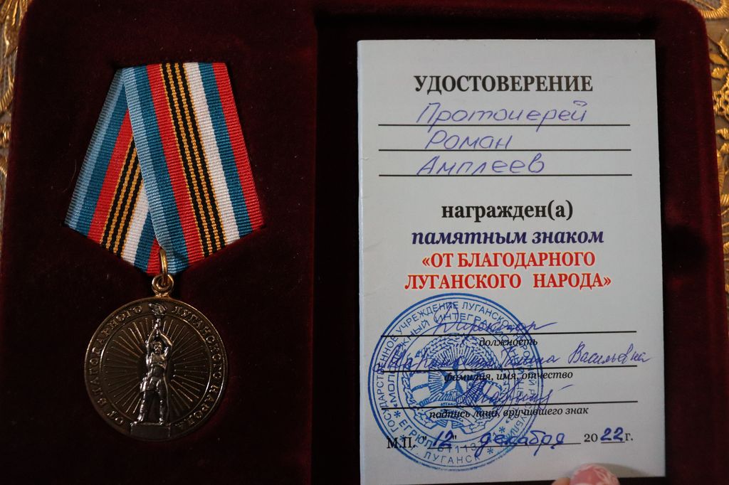 Памятным знаком «От благодарного Луганского народа» награждены протоиерей Роман Амплеев и его помощник Саханина И.В.