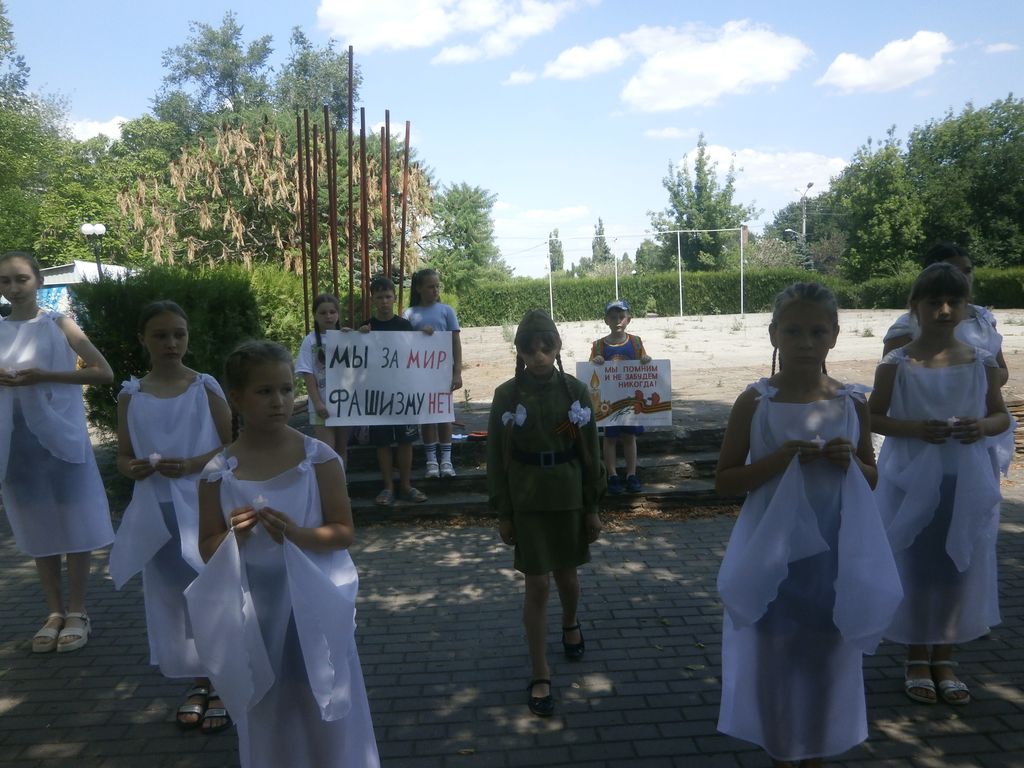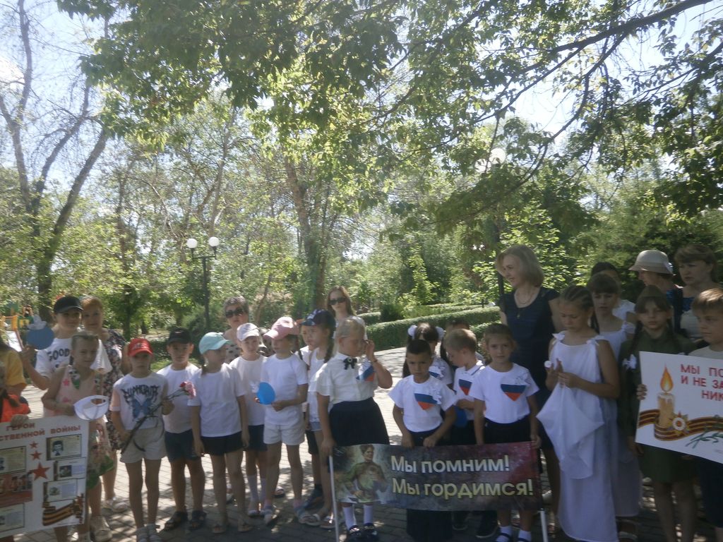 С приветственным словом к участникам акции обратилась помощник по религиозному образованию и катехизации Донецкого округа Фартанова Р.И., напомнив о двадцати семи миллионах погибших в годы войны и о том, что они есть и в каждой семье, о примере героического подвига в годы войны подростка – ученика старейшей в городе школы №1 Гриши Акулова. Фашизм – зло, это нельзя забывать и этому надо противостоять сегодня, как противостоят военнослужащие – отцы, старшие братья, защищая свою семью,свою землю, язык, ценности, традиции, святыни и веру. Участники акции – ребята из пришкольных лагерей десяти общеобразовательных школ, волонтеры отряда «Милосердие», юнармейцы исполняли песни времен войны и читали стихи. Завершилась акция у мемориального комплекса «Они сражались за Родину», где возложили цветы и зажгли свечи памяти.