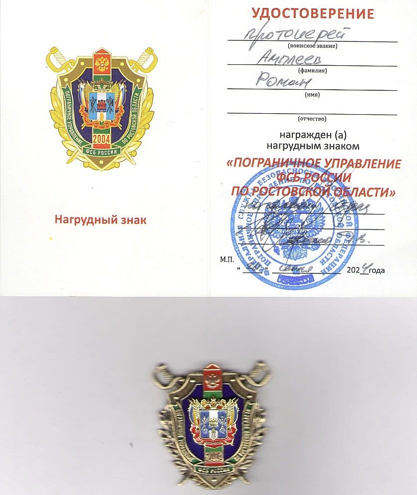 От имени руководства Пограничного управления ФСБ по Ростовской области руководитель отдела Шахтинской епархии по приграничному сотрудничеству, руководитель сектора по взаимодействию с пограничным управлением Федеральной службы безопасности Российской Федерации по Ростовской области, благочинный приходов Новошахтинского округа протоиерей Роман Амплеев и благочинный приходов Гуковского округа протоиерей Виктор Ольховатов были удостоены правом ношения нагрудного знака в честь юбилея службы.
