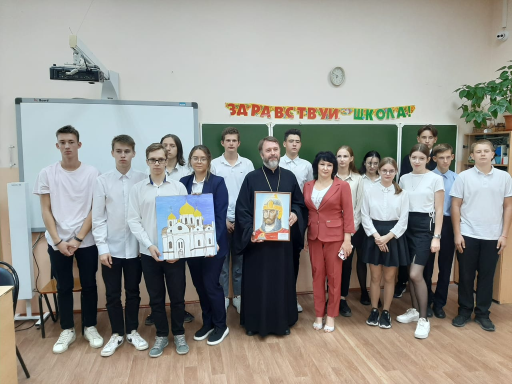 Священник познакомил учащихся с историей жизненного пути святого князя Александра, его выдающимися победами в сражениях, примерами мудрой дипломатии в отношении с ханами Монгольской империи, в стойком и твердом исповедании православной веры в общении с посланниками Папы Римского. Протоиерей Александр обратил внимание слушающих на примеры христианских добродетелей Александра Невского, его стремление сохранения мира на Руси, тому, как он смог примирить враждующие удельные княжества и накопить достаточно сил для сокрушения татаро-монгольского ига.