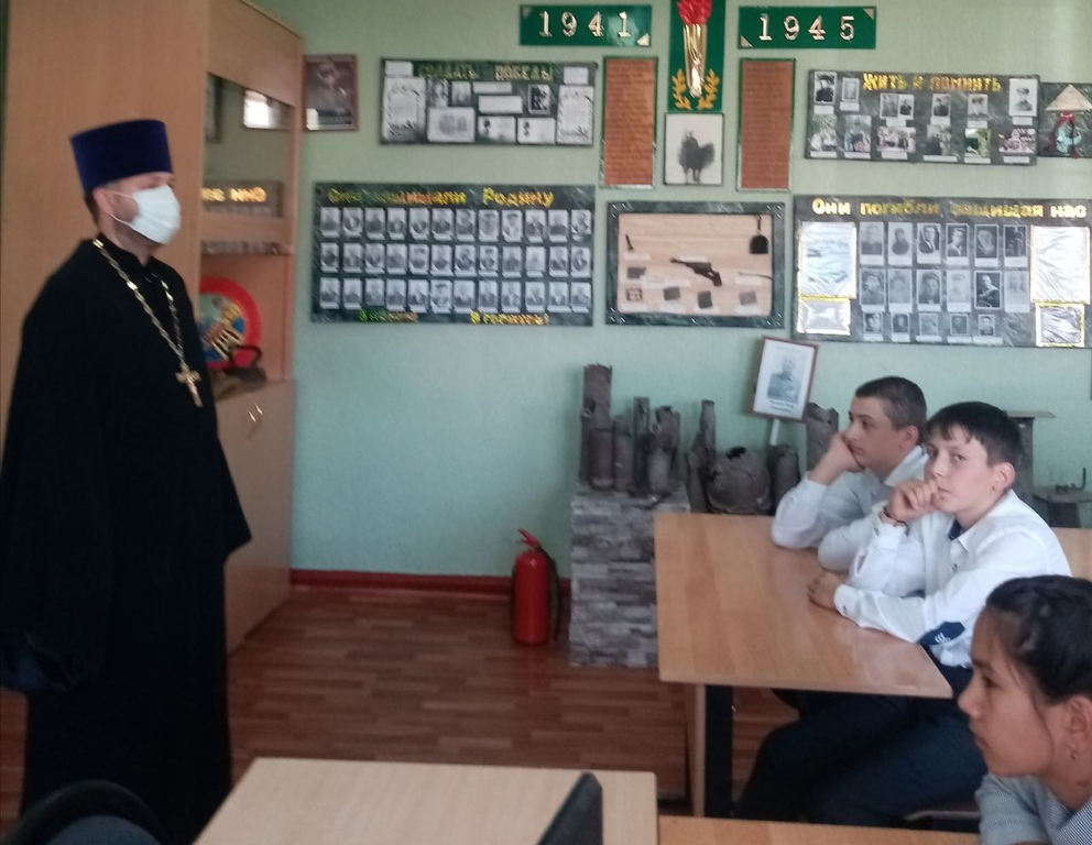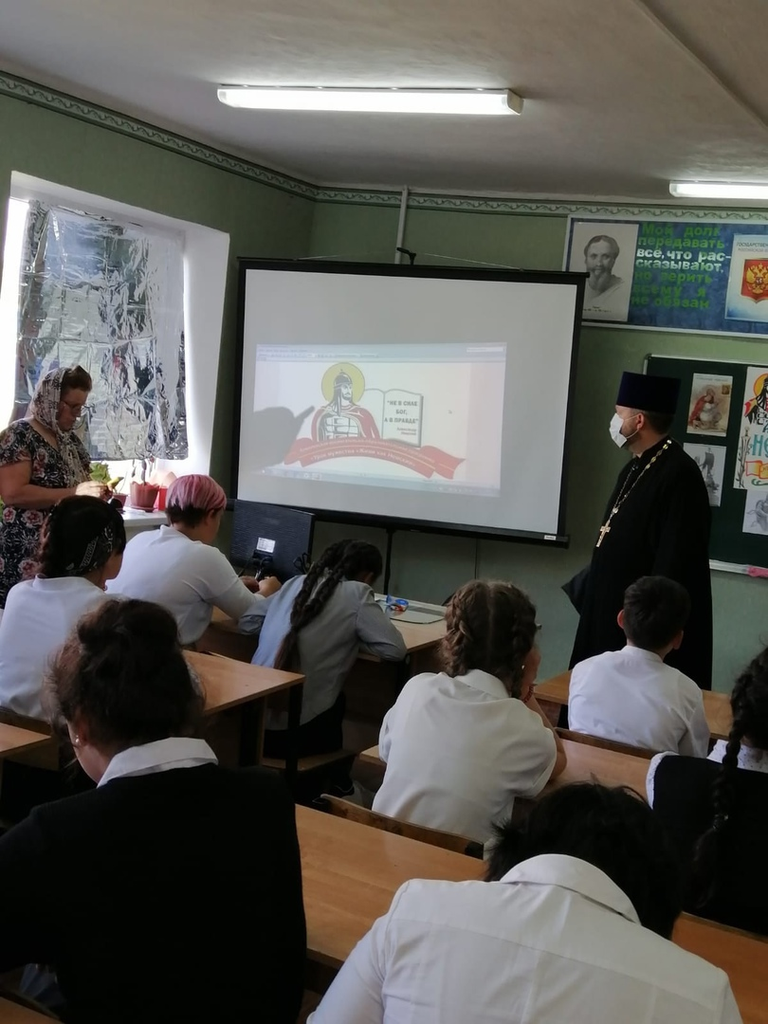 После этого прошел урок, посвященный 80-летию со дня рождения святого благоверного князя Александра Невского. Священник познакомил учащихся 7-8 классов с основными вехами жизни святого князя и указал на необходимость сохранения исторической памяти и патриотического воспитания подрастающего поколения. Учащиеся просмотрели фильм о деятельности молодежного военно-патриотического клуба имени Александра Невского.