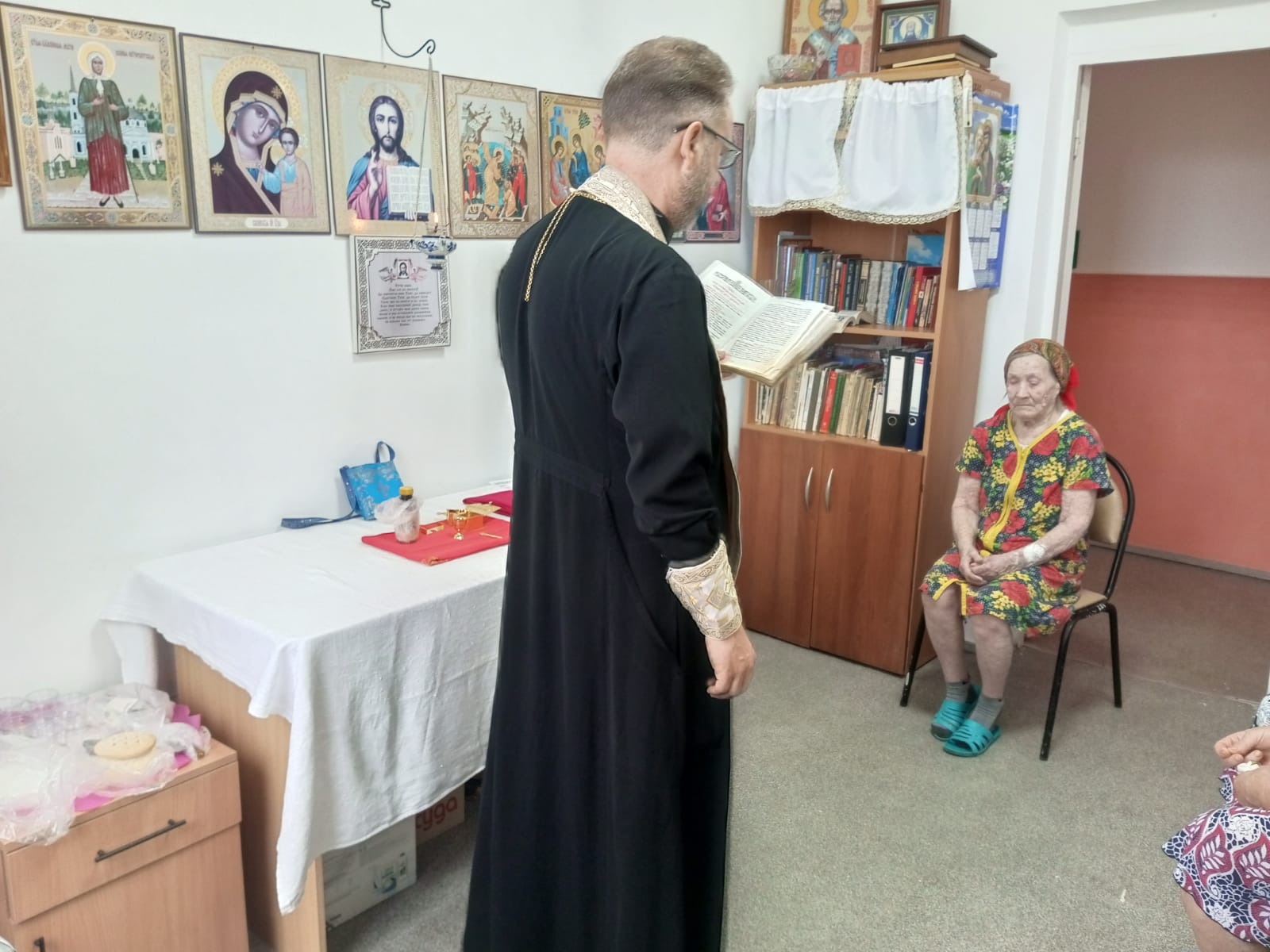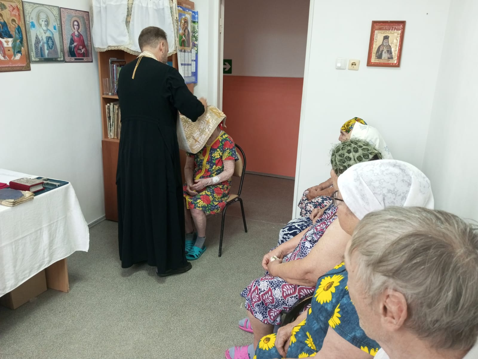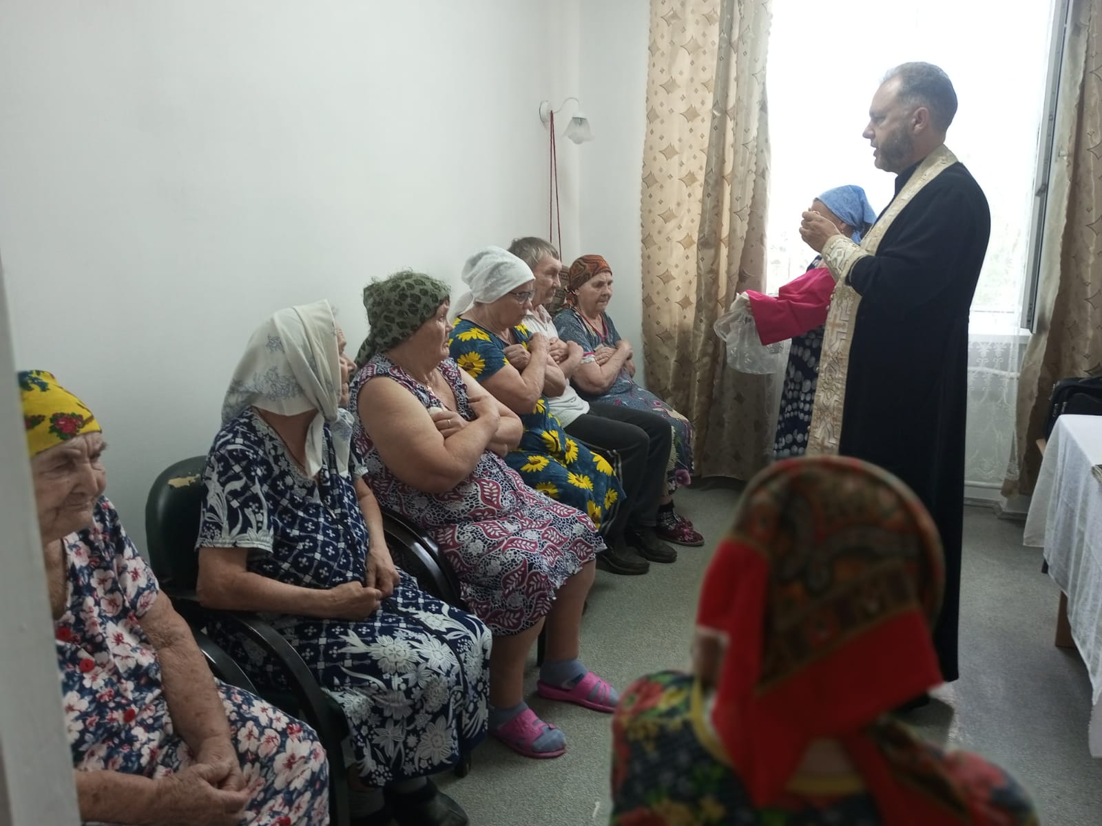 Священник совершил таинства Исповеди и Причастия, помолился о здравии постояльцев и работников учреждения, а затем провел беседу о благодарности человека Богу во всех жизненных ситуациях.