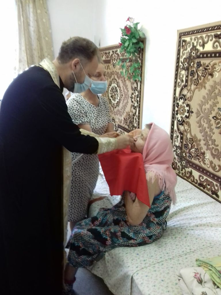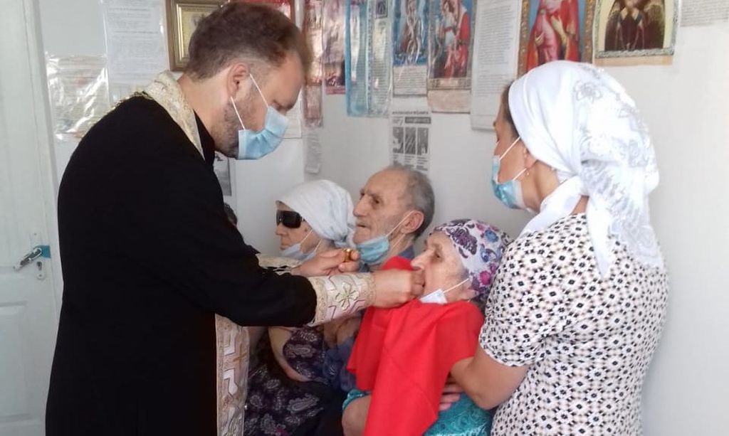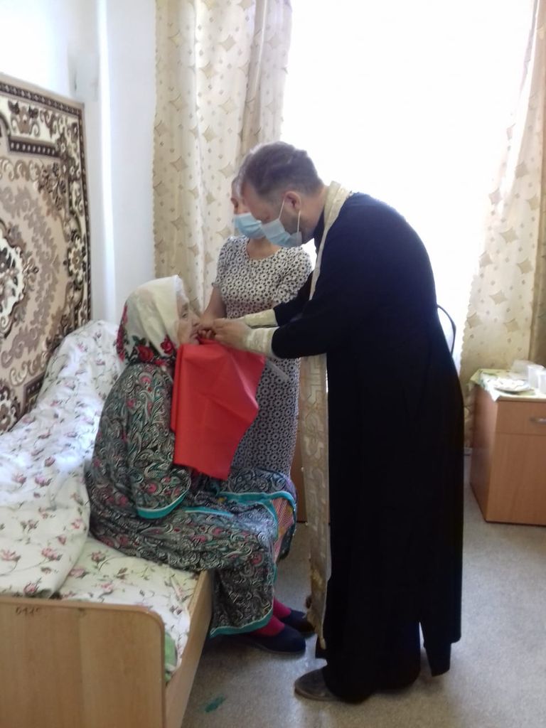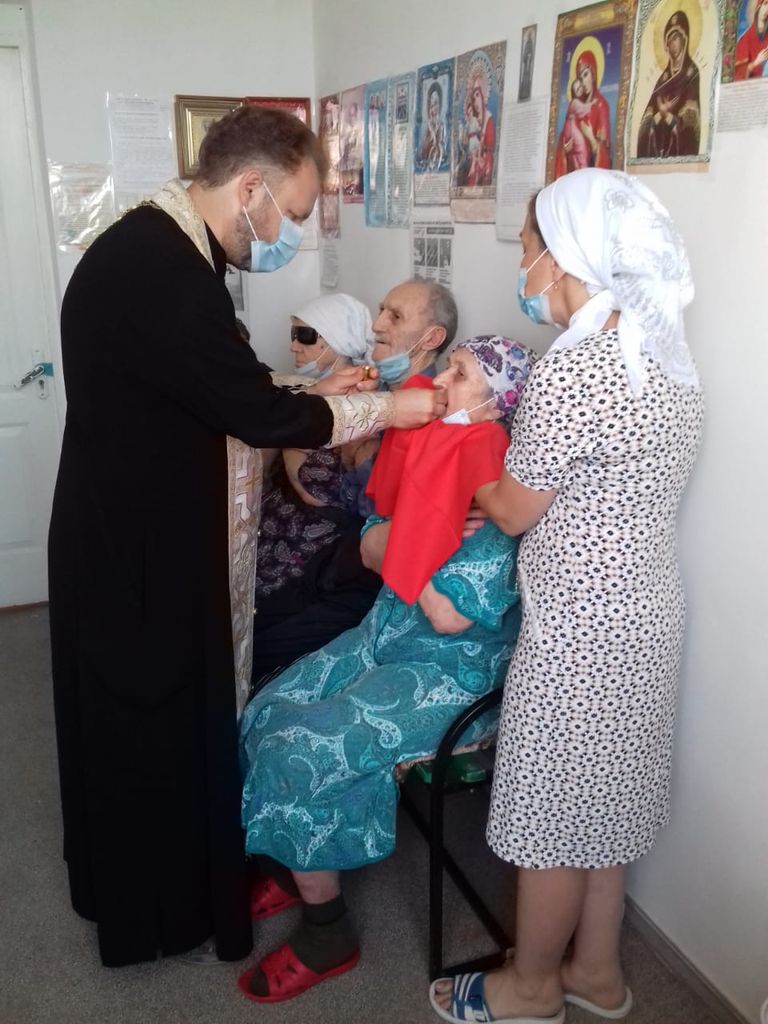 Священник совершил молитву о здравии постояльцев и работников учреждения. Благополучатели Дома престарелых приступили к таинствам Исповеди и Причастия.