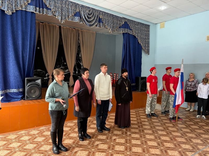 Настоятель храма святой равноапостольной княгини Ольги иеромонах Арсений (Алимов) выступил со словом перед собравшимися жителями поселка и учащимися школы.