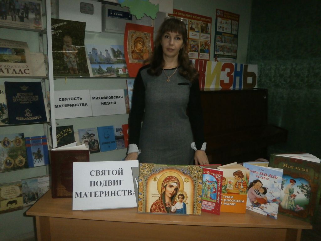 Ребята познакомились с презентацией «Святость материнства» и, в ходе обсуждения, пришли к выводу, что женщина-мать – начало жизни человека, источник любви, ласки, доброты души и высокого духа, сострадания и милосердия, хранительница домашнего уюта, читали стихи русских классиков о матери, находя в них самые значимые слова для своих мам. Обзор литературы «У книжной полки – о святом подвиге матери» провела член клуба, библиотекарь Покусина Ю.М. Завершился урок творческим домашним заданием: нарисовать рисунок «Моя мама», отразив в нем лучшие черты своей мамы.