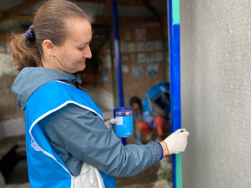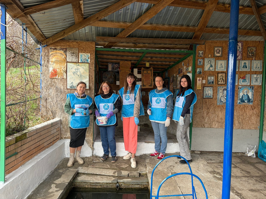 Ребята побелили часть стены, где располагаются иконы, покрасили дверь на раздевалке, столбы и перила, которые частично поржавели после зимы, убрали сухие ветки и почистили отток воды.