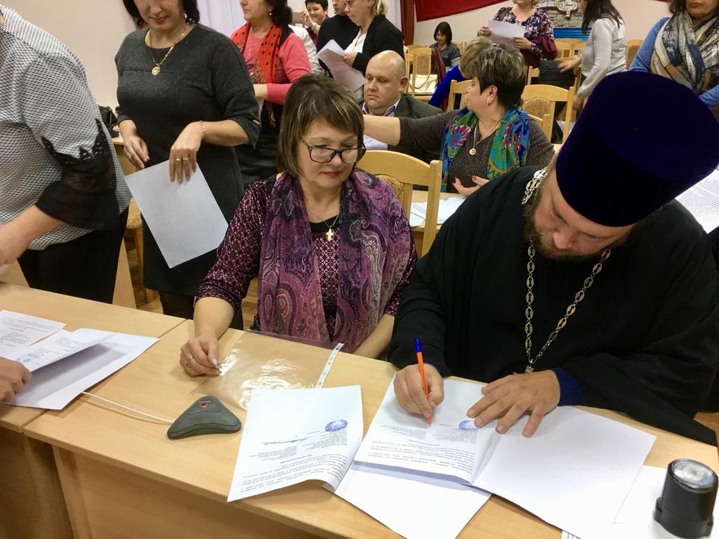 После завершения конференции, в актовом зале администрации района состоялось заключение соглашений о сотрудничестве между духовниками образовательных учреждений со статусом «казачьи» и руководителями этих учреждений. Председатель епархиального отдела по взаимодействию с казачеством протоиерей Александр Маштанов ознакомил директоров школ и заведующих детскими садами с основными задачами духовника по работе с обучающимися, педагогами и родителями.