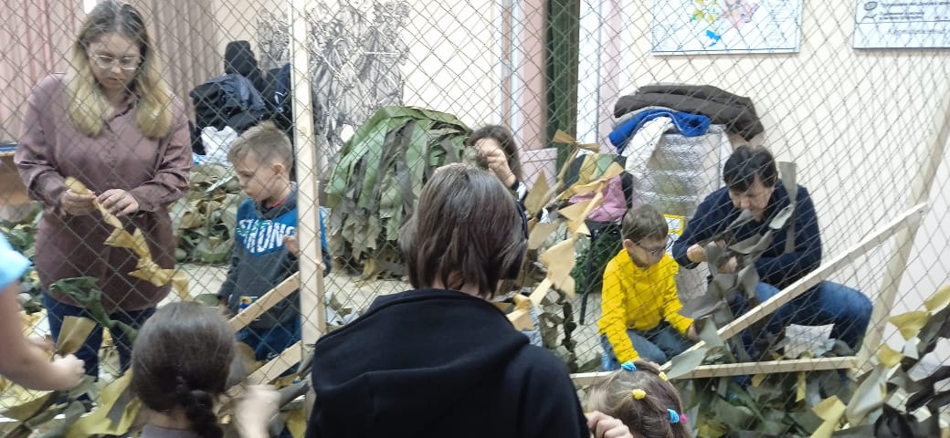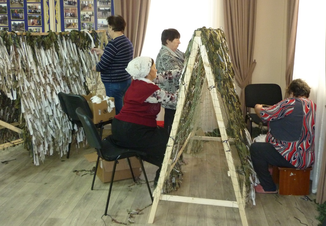 Приходские добровольцы не только собирают гуманитарные грузы, но и активно с другими волонтёрами плетут для участников военной операции сети для маскировки военной техники и вооружения, внося свой посильный вклад в помощь военнослужащим.