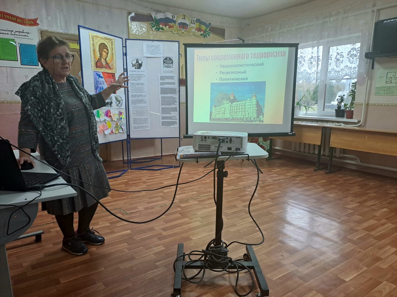 Педагог-организатор Бурим Е.Б. рассказала об истории и смысле терроризма, привела цитаты из Библии и Корана, осуждающие убийство и насилие.