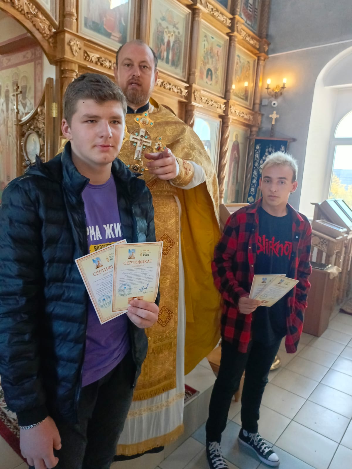 В октябре и ноябре 2023 года, в храме Донской иконы Божией Матери города Новошахтинска, продолжилось награждение добровольцев из НТПТ-ф ГБПОУ РО «ШРКТЭ им. ак. П. И. Степанова» и добровольцев из НГБПОУ РО «Новошахтинский технологический техникум». Так же сертификаты получили сестры милосердия Донского храма – активные участники акции. Протоиерей Роман Амплеев, настоятель Донского храма, благочинный приходов Новошахтинского округа, руководитель епархиального отдела по взаимоотношениям Церкви с обществом наградил добровольцев и вручил сертификаты за служение в деле милосердия.