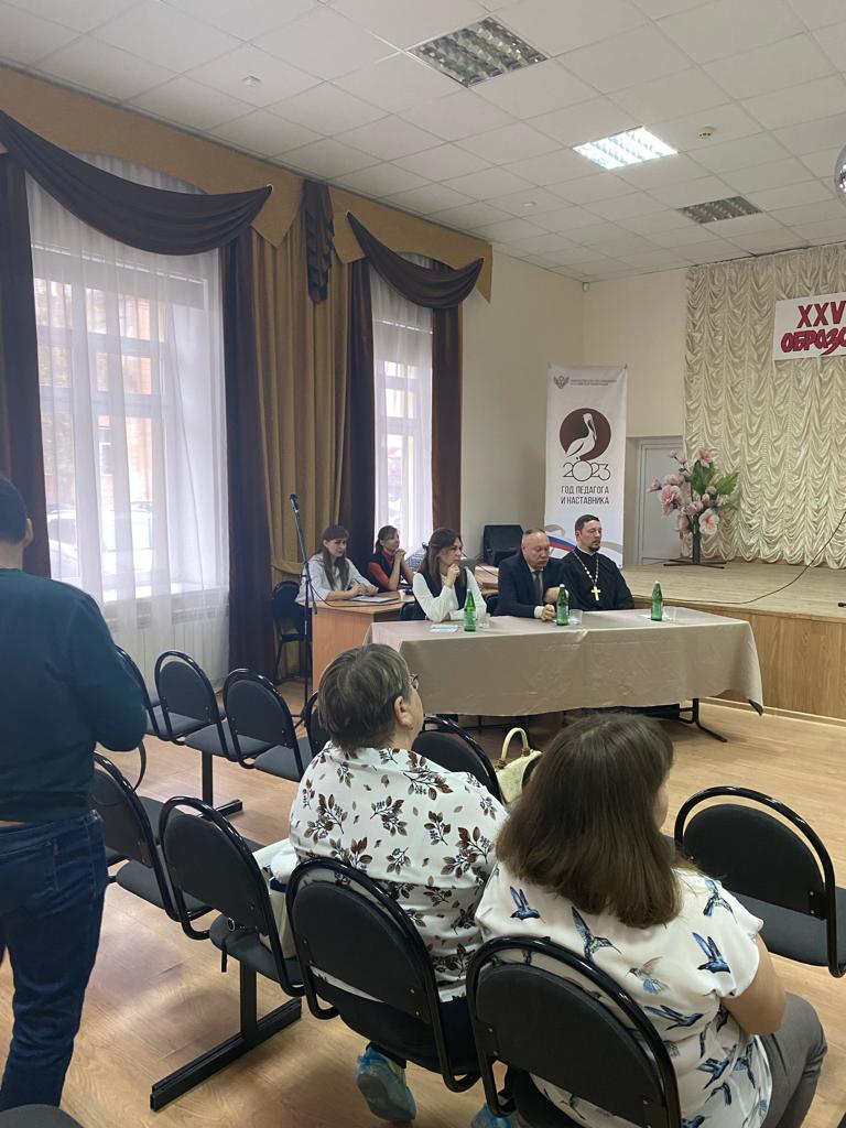 По приглашению отдела образования Верхнедонского района благочинный Верхнедонского округа иерей Роман Митяшин принял участие в мероприятии на тему: «Укрепление традиций Российских духовно-нравственных ценностей, культуры и исторической памяти».
