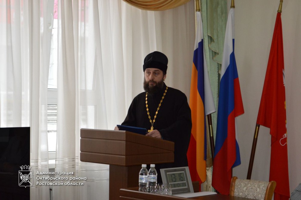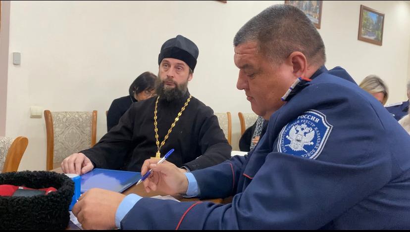 Благочинный приходов Нижнедонского округов протоиерей Сергий Яценко рассказал о взаимодействии приходов благочиния и казачьих духовников с казаками казачьего общества «Нижнедонской Юрт» окружного казачьего общества Первого Донского округа войскового казачьего общества «Всевеликое войско Донское».