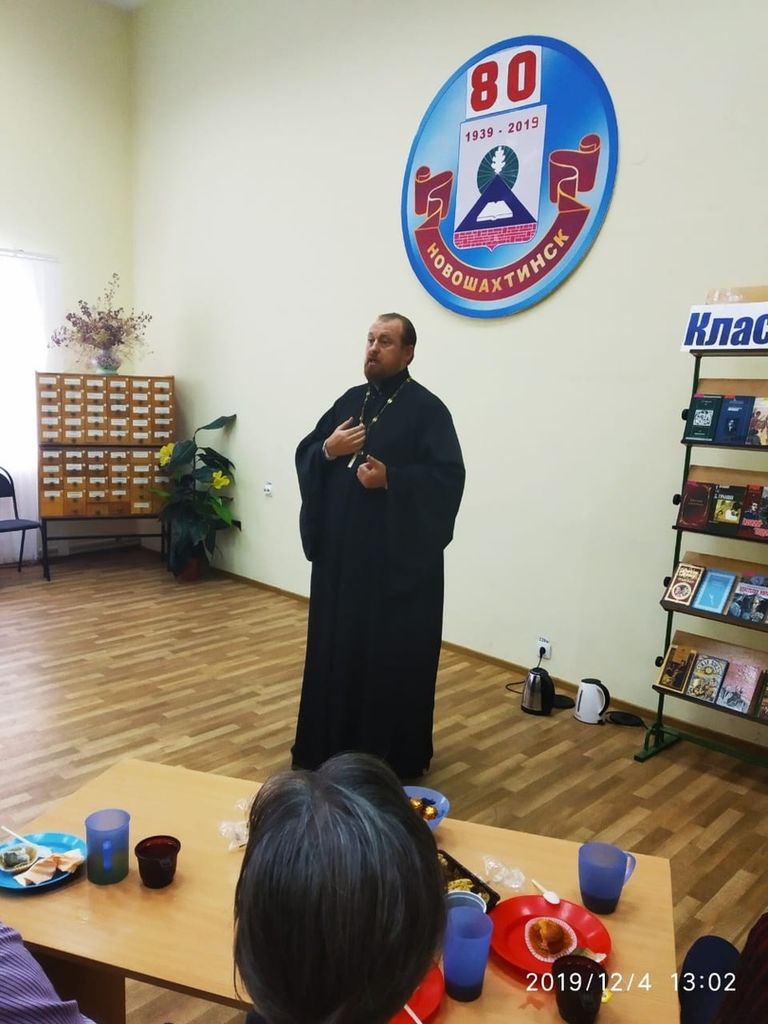 Настоятель храма в честь Донской иконы Божией Матери, благочинный приходов Новошахтинского округа, руководитель отдела по взаимоотношению Церкви с обществом Шахтинской епархии протоиерей Роман Амплеев посетил встречу. Священник подарил подарки к чаепитию, пожелал всем присутствующим душевных и телесных сил, помощи Божией, спасения Души и рассказал притчу о силе молитвы и мудром православном воспитании.