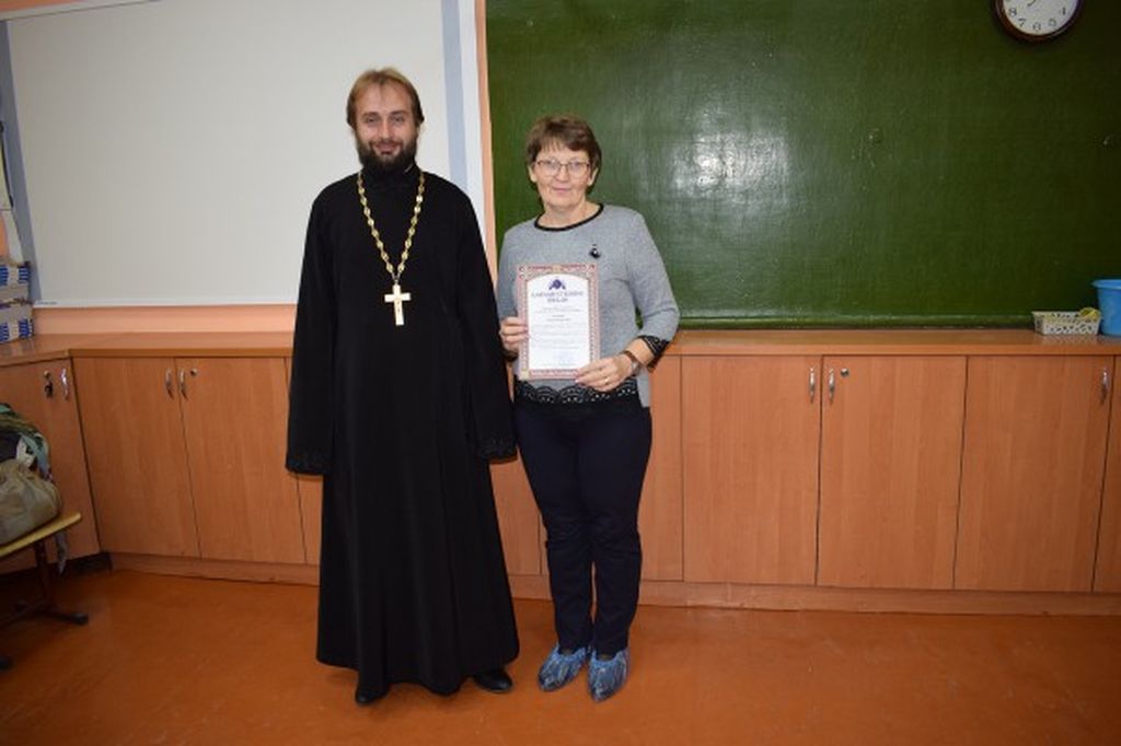 Священник наградил благодарственными письмами епископа Шахтинского и Миллеровского Симона участников XIV ежегодного Всероссийского конкурса в области педагогики, воспитания и работы с детьми и молодежью до 20 лет «За нравственный подвиг учителя»: призера конкурса - учителя МБОУ СОШ № 43 Л.Ю. Копейка и эксперта конкурса – учителя МБОУ СОШ № 23 С.И. Мумикову.