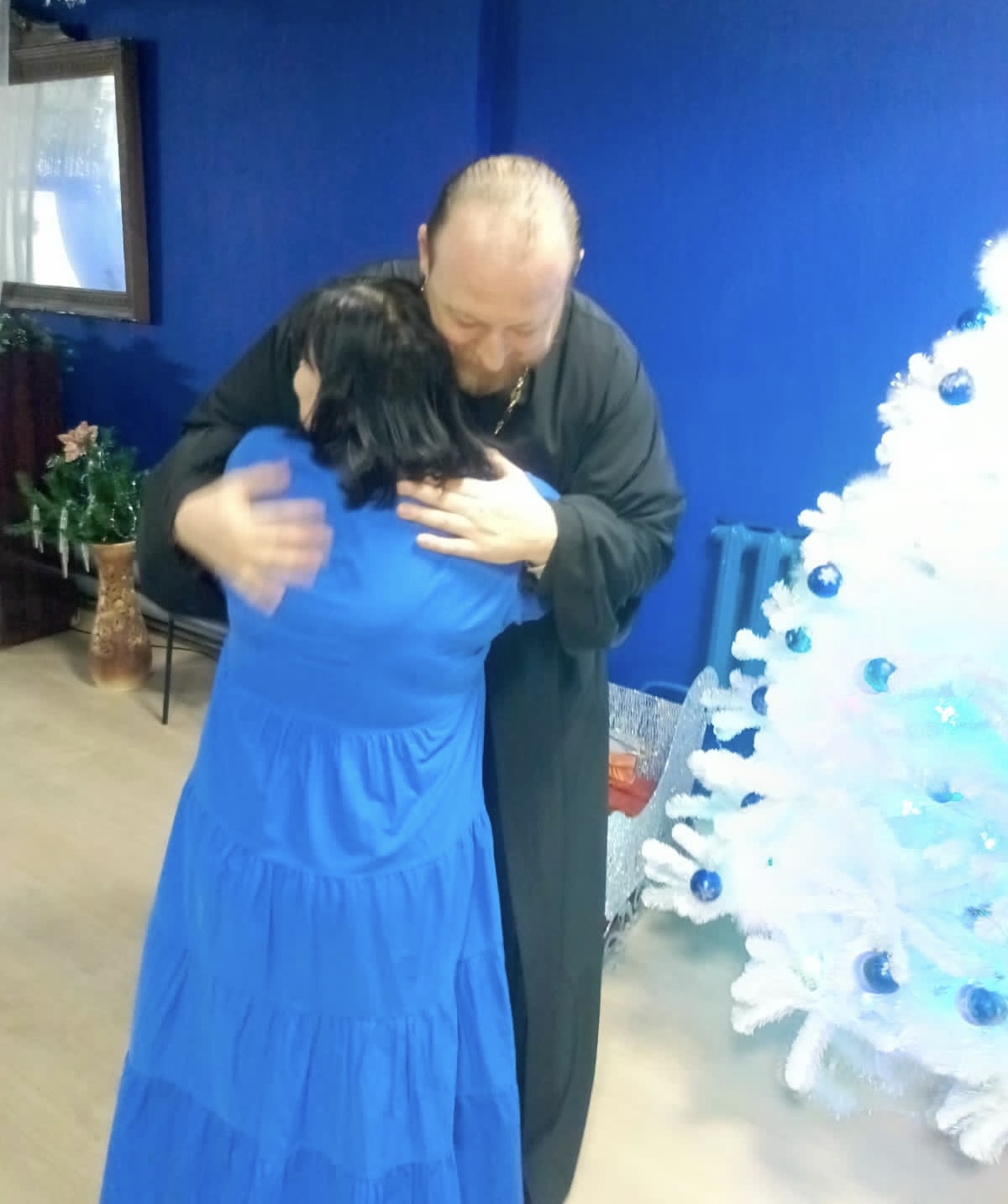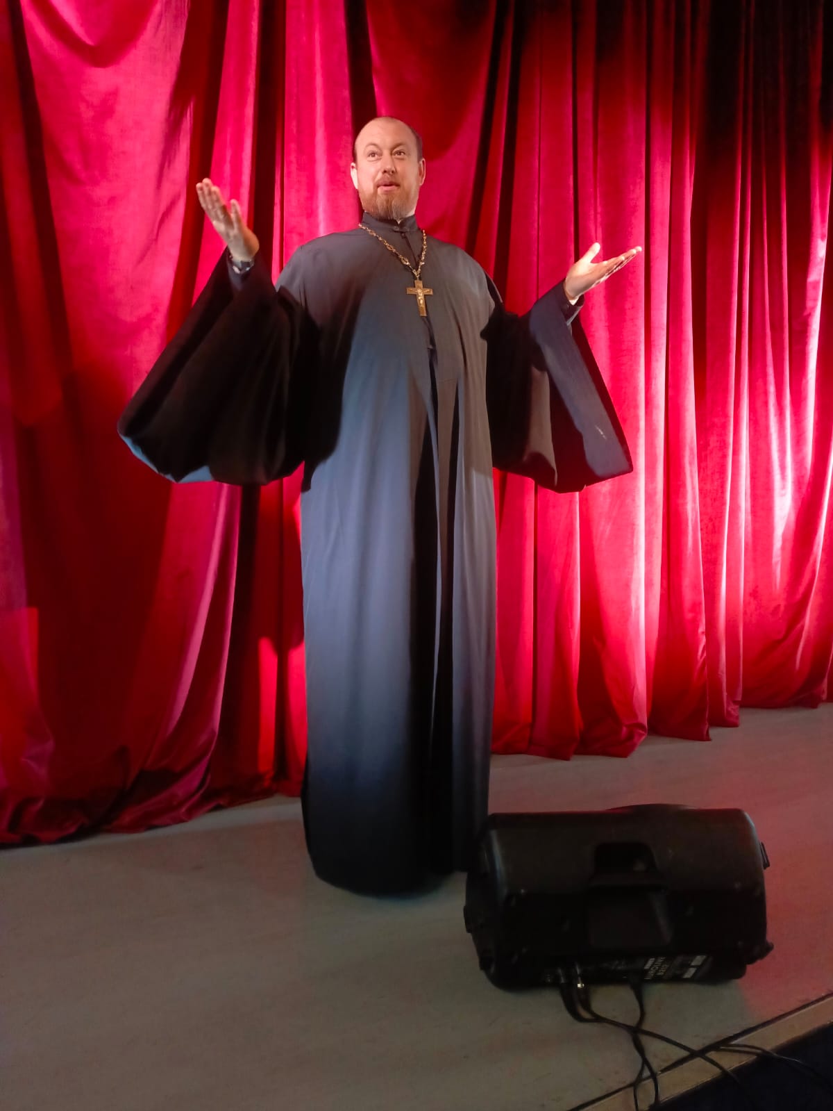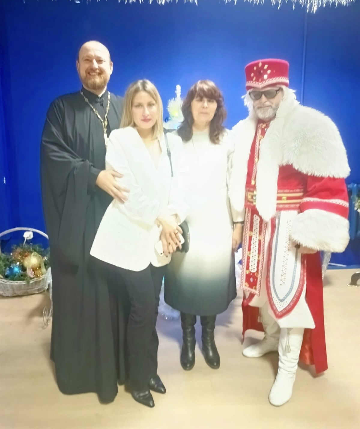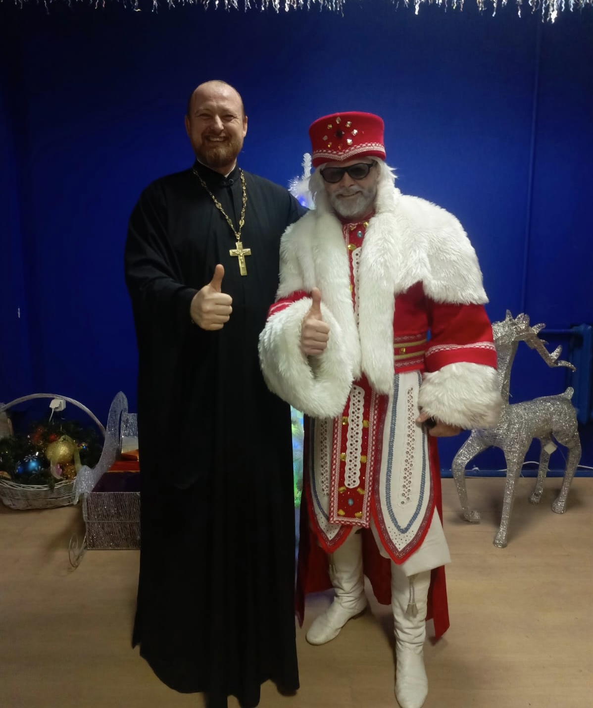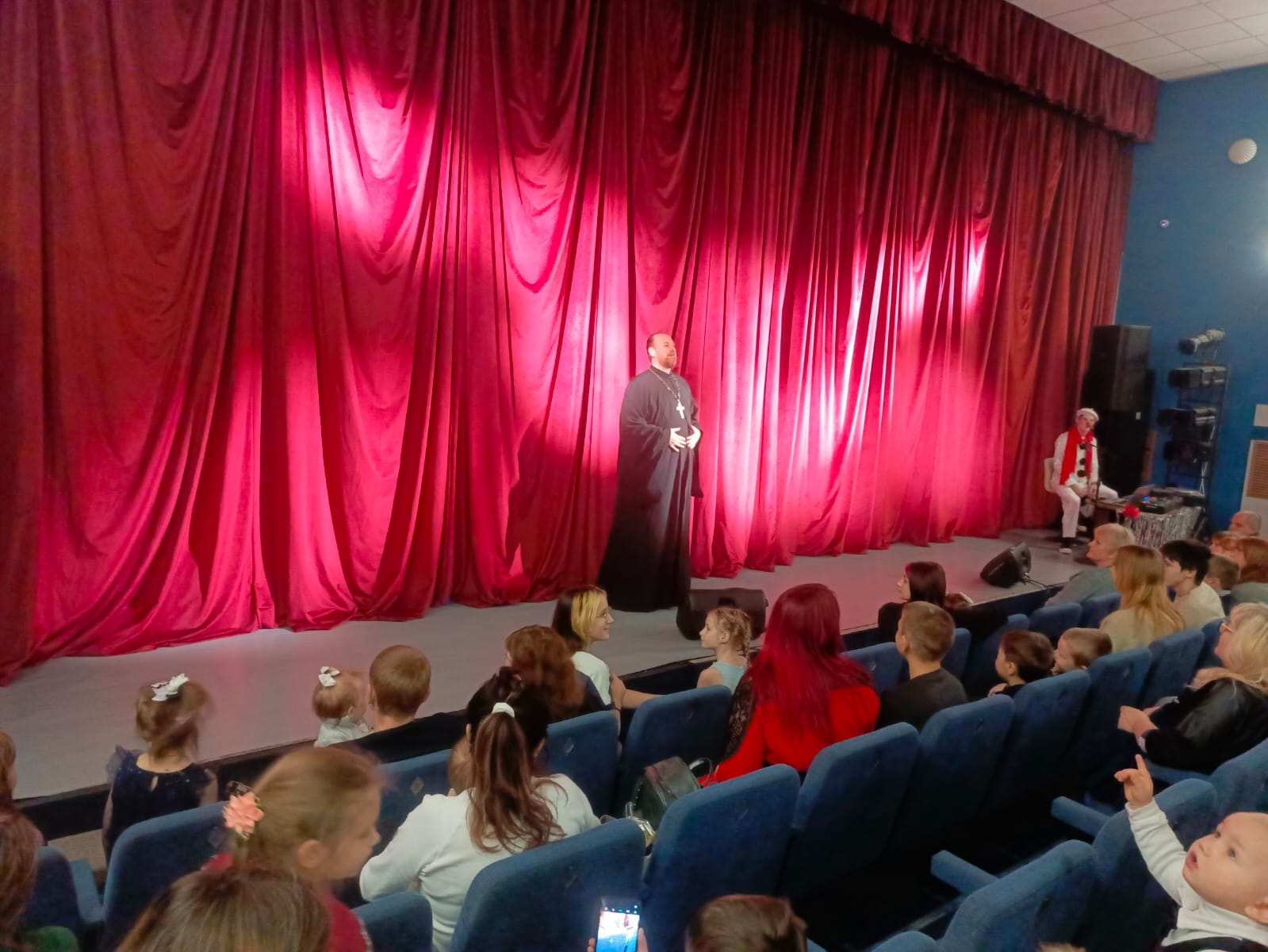 В начале представления перед детьми и родителями с Рождественским поздравлением выступил протоиерей Роман Амплеев, настоятель храма в честь Донской иконы Божией Матери, благочинный приходов Новошахтинского округа, председатель отдела по взаимоотношениям Церкви с обществом Шахтинской епархии, который поблагодарил главного режиссёра театра Сопову Светлану Николаевну, артистов и администрацию театра за подаренный детям праздник и поздравил всех с Рождеством Христовым.